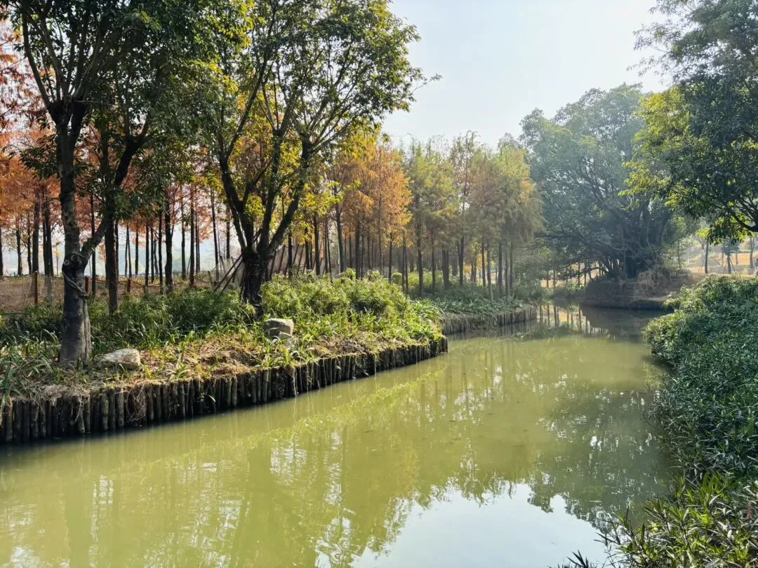 沿河有一大片落羽杉林。园内鸟种很丰富,树林附近的几棵树,上面住了很多大山雀和暗绿绣眼鸟,在附近就能听见它们在树上鸣叫,还能看到普通翠鸟,池鹭,鸠子,鹎鹎,等等。