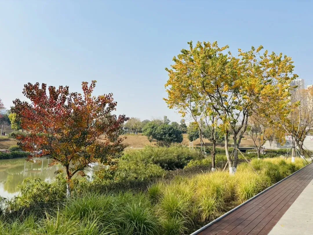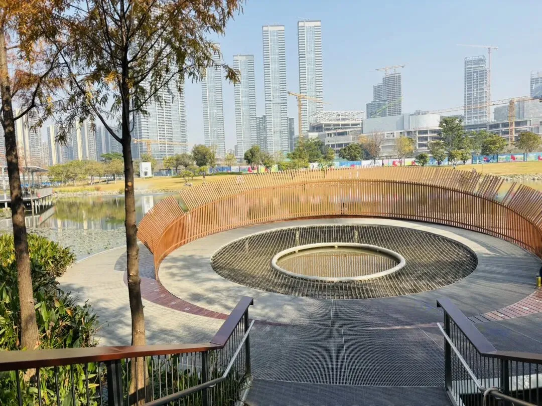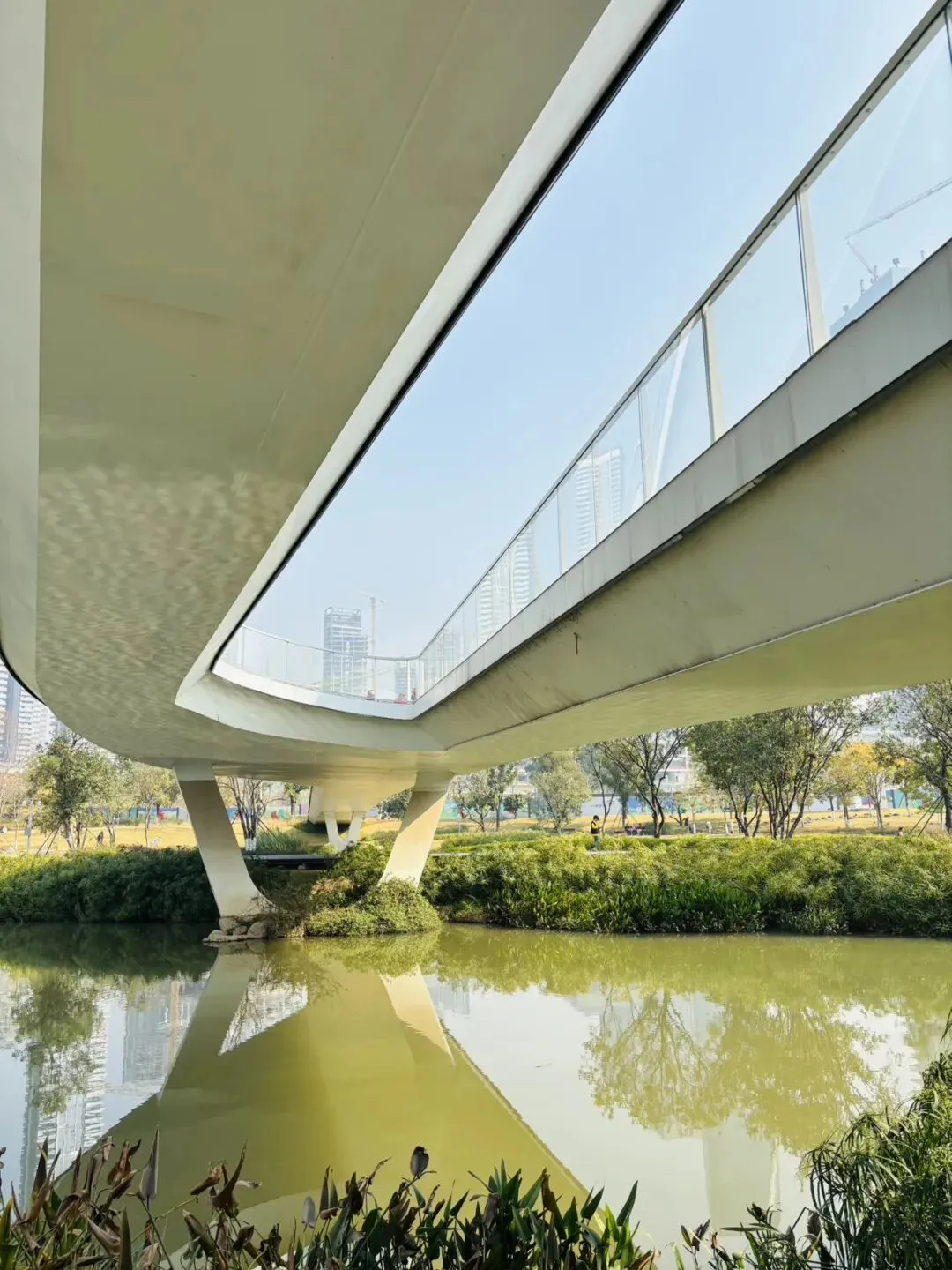 巧妙地将自然水文与景观体验相结合。梳理和拓展现有河涌,构建起蜿蜒贯通的核心水系,形成了灵动的水景视觉廊道,更发挥着重要的雨洪调蓄与净化功能。 精心营造的湿地泡、生态驳岸与水生植物群落,构成了具有生命力的“城市之肾”,默默过滤着地表径流,为生物提供栖息地,也向市民直观展示着自然净化的奥秘。 这种以生态基础设施为先导的“海绵城市”理念实践,使公园超越了一般休闲场所的范畴,成为保障城市韧性的一道关键生态屏障。 东莞中心公园,拿过国际设计大奖,给人“城在园中”的视觉盛宴,一进门就被震撼到,蓝天+绿树+玻璃幕墙高楼,随手一拍都是都市与自然融合的大片。