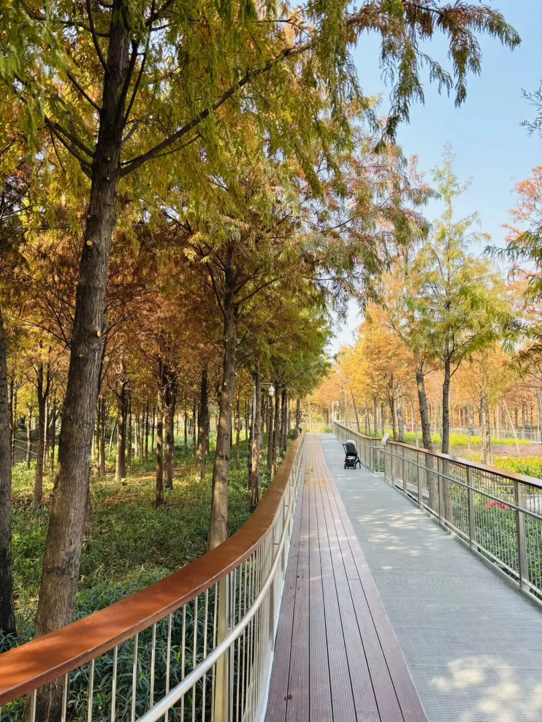 沿着湖边走,脚步不自觉放慢,水波轻轻推着倒影,落羽杉在风中舒展枝条,每一步都像踩在诗意里。