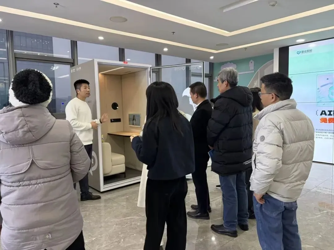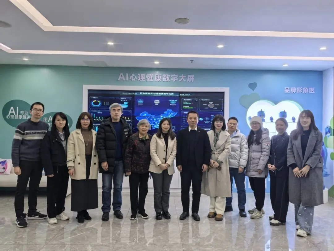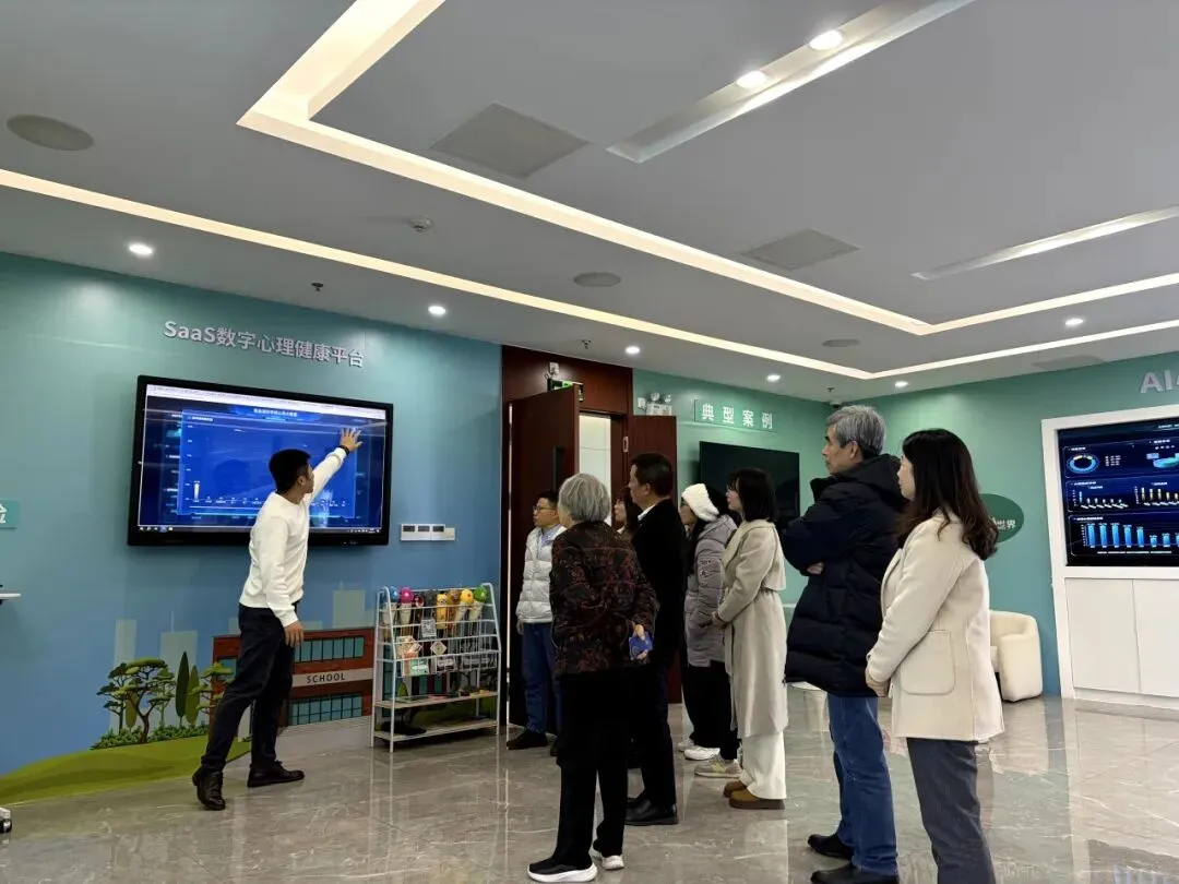 会议结束后,全体与会人员在欧红君副会长的陪同下参观了广东数业智能科技有限公司。作为中国数字心理健康领域的领军企业,该公司始终致力于通过AI技术推动心理健康服务走向普惠与智能,是“数字社工”理念的前沿实践者。工作人员现场展示了AI技术在心理评估、心理服务等场景的创新应用,包括AI心理减压舱、AI角色引擎和智能心理成长中心等,为与会人员呈现了科技赋能社会工作的生动实践。