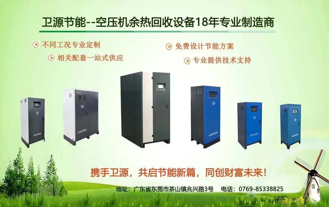 东莞市卫源节能环保科技有限公司是一家专业从事环保节能设备研发、设计、生产、销售及售后服务于一体的高新技术型企业。本公司始终坚持“专业、诚信”的经营理念和“领先一步、用心服务”的服务宗旨,以不断满足广大客户对节能减排的需求为己任,以科技创新为发展动力,不断研发新节能产品。 卫源公司自2009年成立以来,投入大量人力和财力,精心打造节能系列产品。其中,主打产品-卫源余热回收机已应用到各个领域余热回收利用。特别是针对空气压缩机的余热回收利用,节能率高达90%以上,所回收的热能广泛应用于企业员工洗澡用热水、车间生产工艺用热水、车间供暖、烘干房等,为客户带来巨大的节能效益。