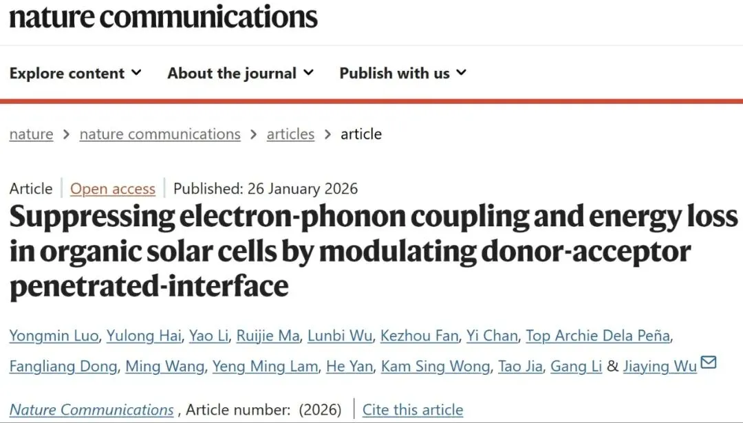 Yongmin Luo, Yulong Hai, Yao Li. et al. Suppressing electron-phonon coupling and energy loss in organic solar cells by modulating donor-acceptor penetrated-interface. Nature Communications. (2026).