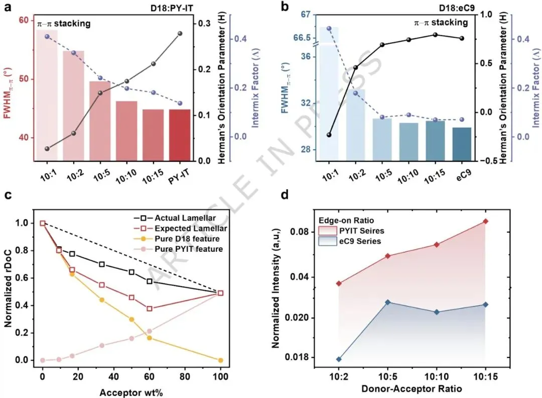 图2. E -和P -界面的形态分析。(a)和(b)PA系统和SMA系统在OOP方向的堆积峰的半峰全宽(FWHM)(直方图)、赫尔曼取向参数(H)和混合因子(Λ)𝜋𝜋。(c)共混膜中的层状特征是供体和受体的单独层状特征的组合,与预期的rDoC相比,实际层状特征的rDoC更高,表明混合相包含超过预期的堆积层状有序。(d)两个体系的(衍射环的)边缘衍射强度与层状堆积峰的比率。