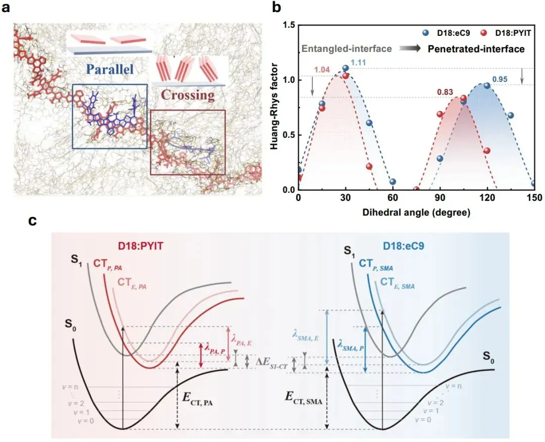 图3.两个系统的P-和E-界面的模拟图示。(a)具有平行和交叉结构的E-和P-界面形状的MD图示。(b)具有不同二面角的两个系统的计算的Huang Rhys因子。(c)E-和P-界面的S0状态,CT状态的势能曲线示意图,PA和SMA体系的S1非绝热态及其重组能。