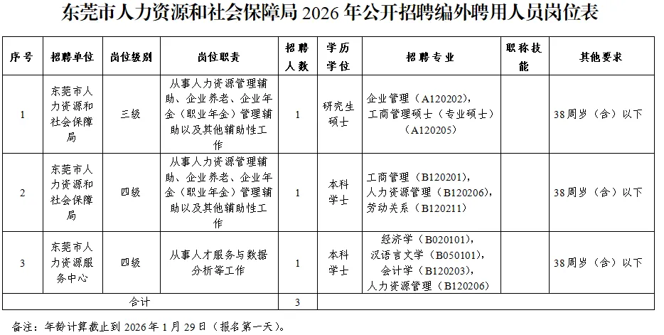 根据《东莞市机关事业单位编外聘用人员管理办法(试行)》有关规定,东莞市人力资源和社会保障局决定公开招聘3名普通聘员,现将有关事项公告如下: