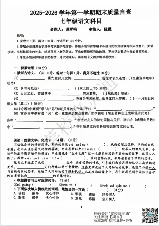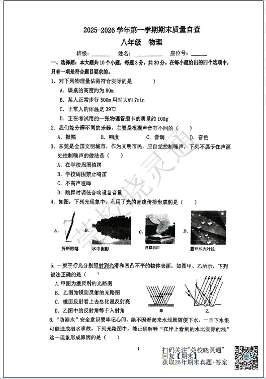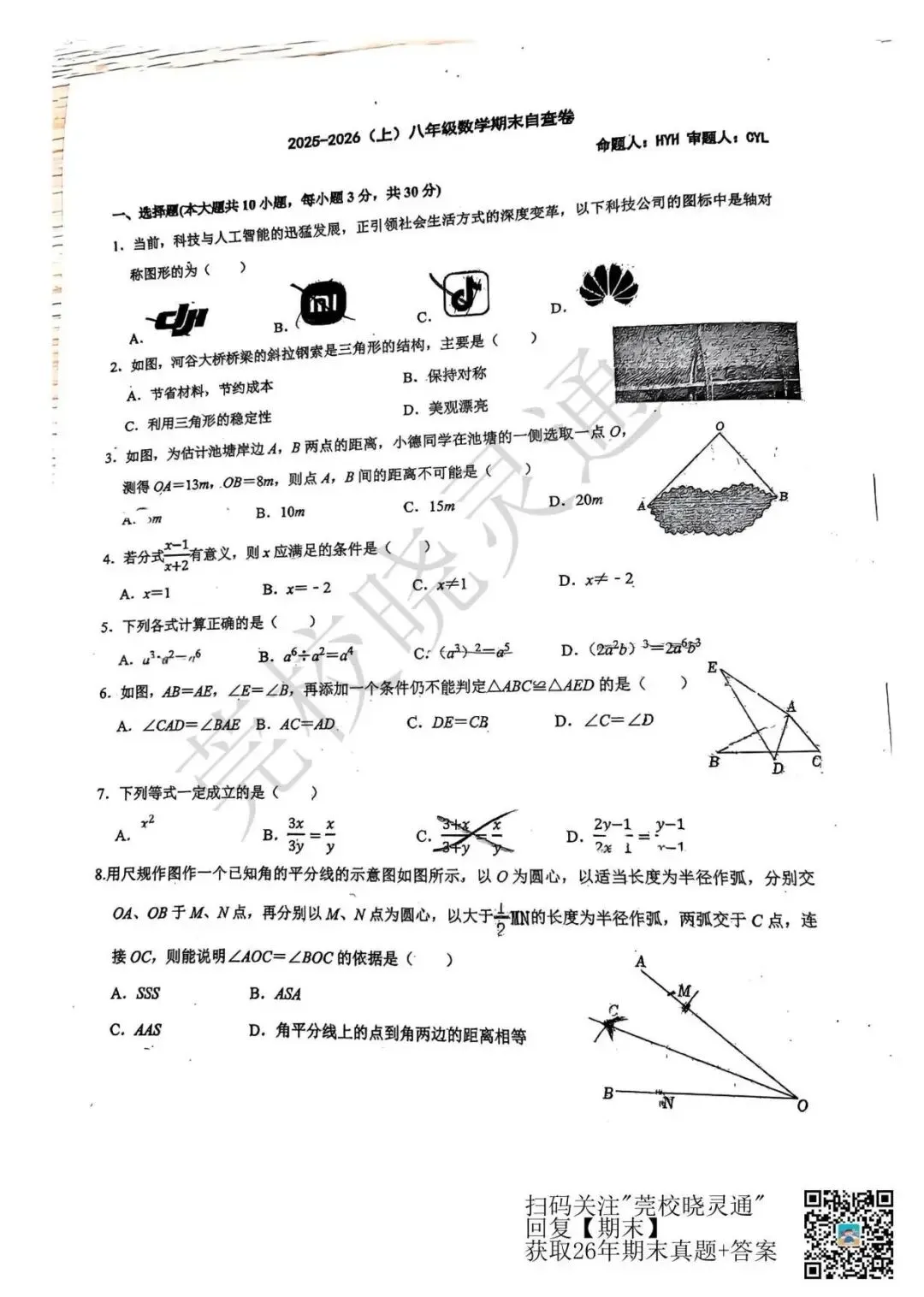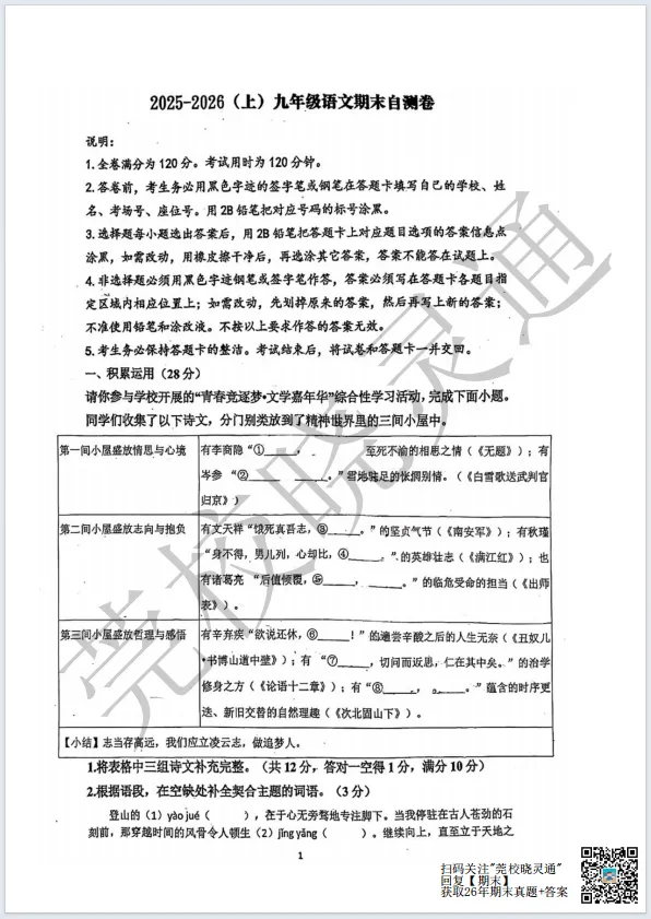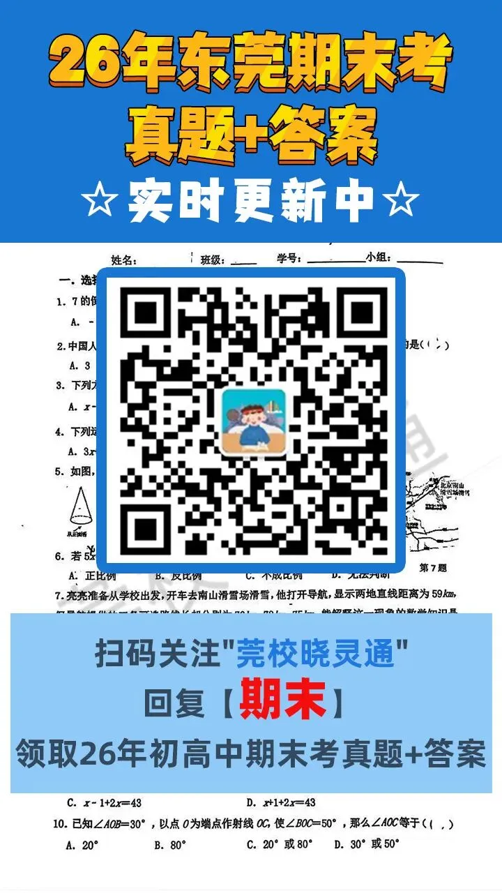 有其他年级、科目的期末试卷关注公众号“莞校晓灵通“