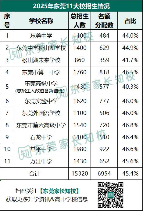 2025年开始,石龙中学、常平中学、万江中学3所学校纳入名额分配校,名额分配学校有8所增加到11所,这11所学校也被称为“东莞11大校”