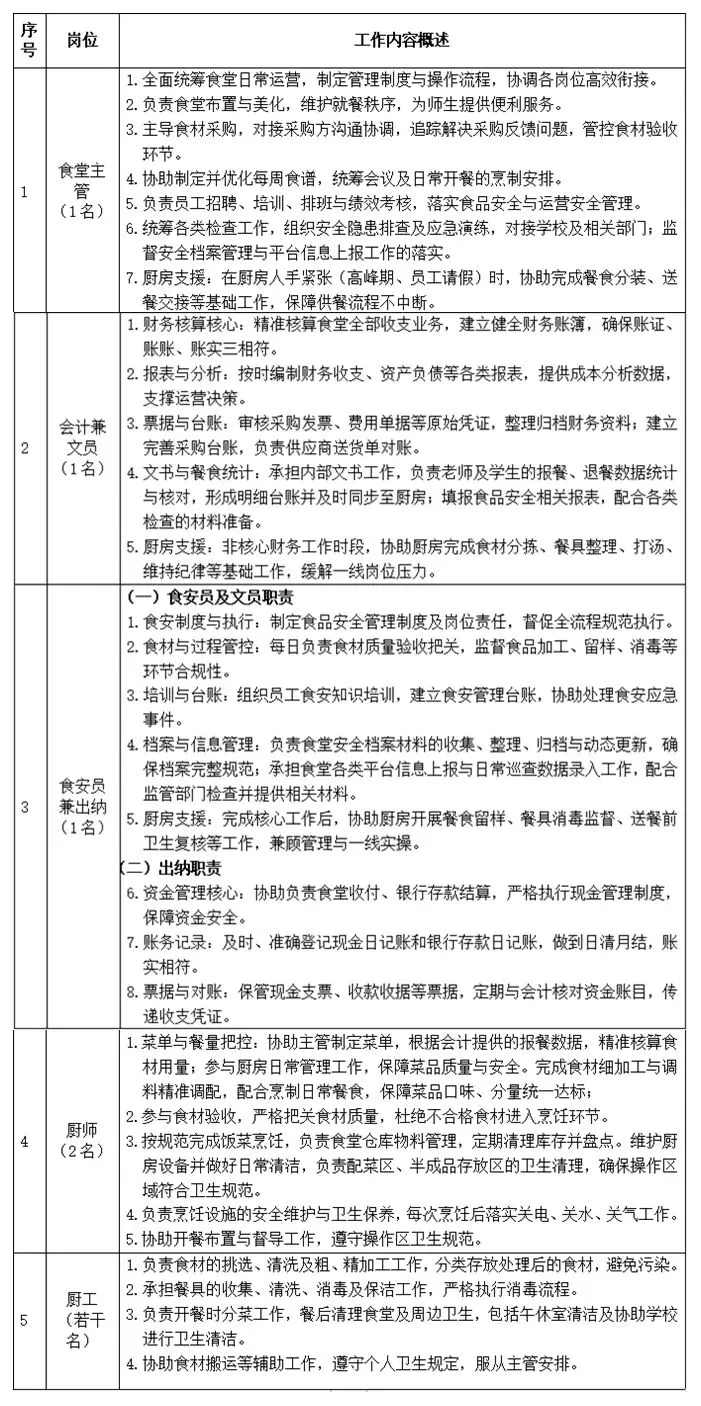 此次招聘食堂主管、食品安全管理员(兼出纳)、会计(兼文员)、厨师、厨工。