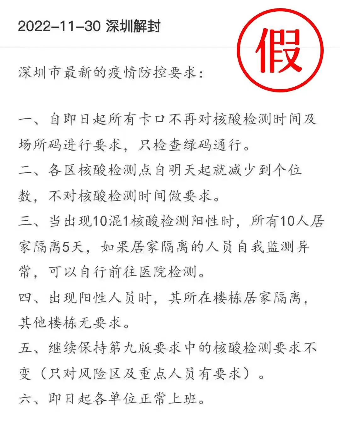 传言称,深圳市于2022年11月30日“解封”,且称,即日起所有卡口不再对核酸检测时间及场所码进行要求,只检查绿码;当出现10混1核酸检测阳性时,10人居家隔离5天,居家隔离人员自我监测异常,自行前往医院检测;出现阳性人员时,其所在楼栋居家隔离,其他楼栋无要求等。