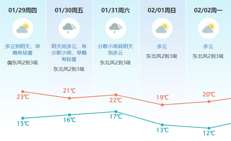 预计,我市29日多云到阴天,早晚有轻雾;
