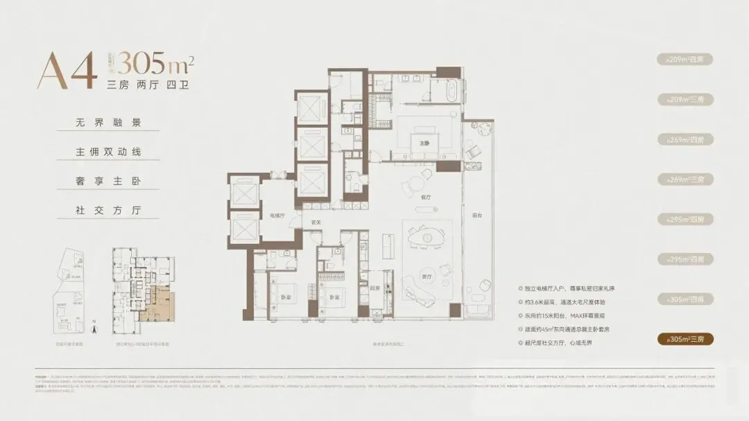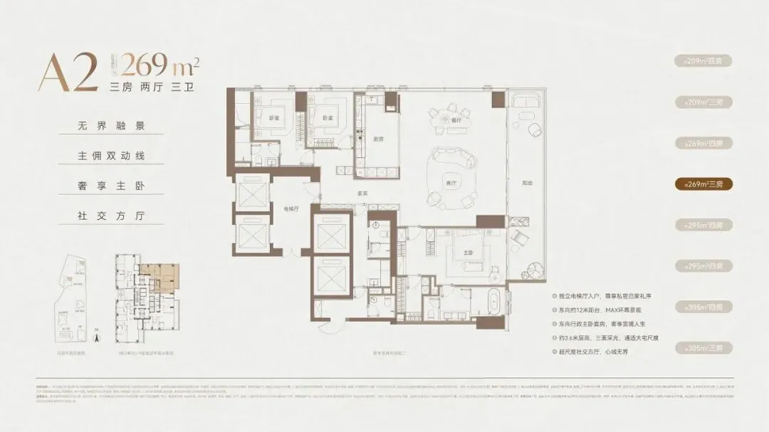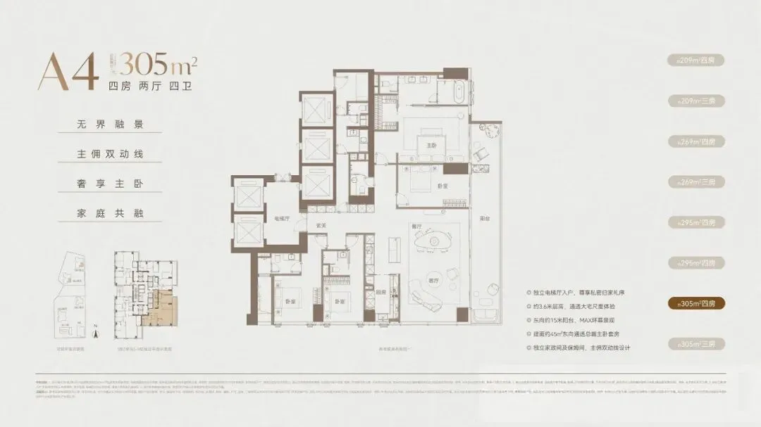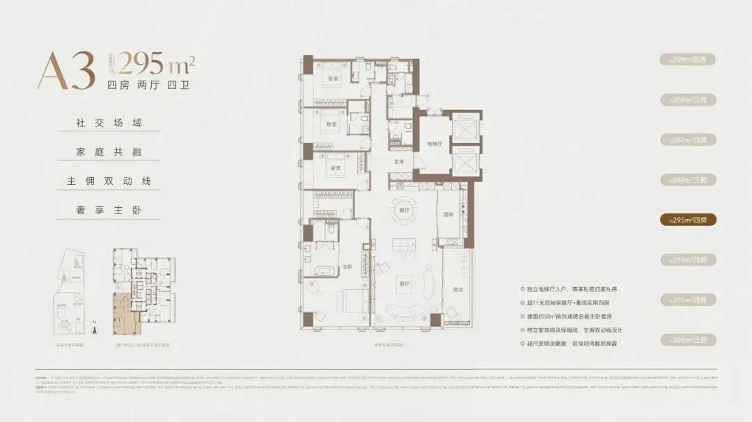 二期南区的分布和北区稍有不同,南区占地大一点,其中住宅为2-1栋、2-2栋,曝光出来面积段是约198-209-225-245-269-294-304㎡四房户型为主,户型对比北区也都是全新不同的!(具体还以官方为准)