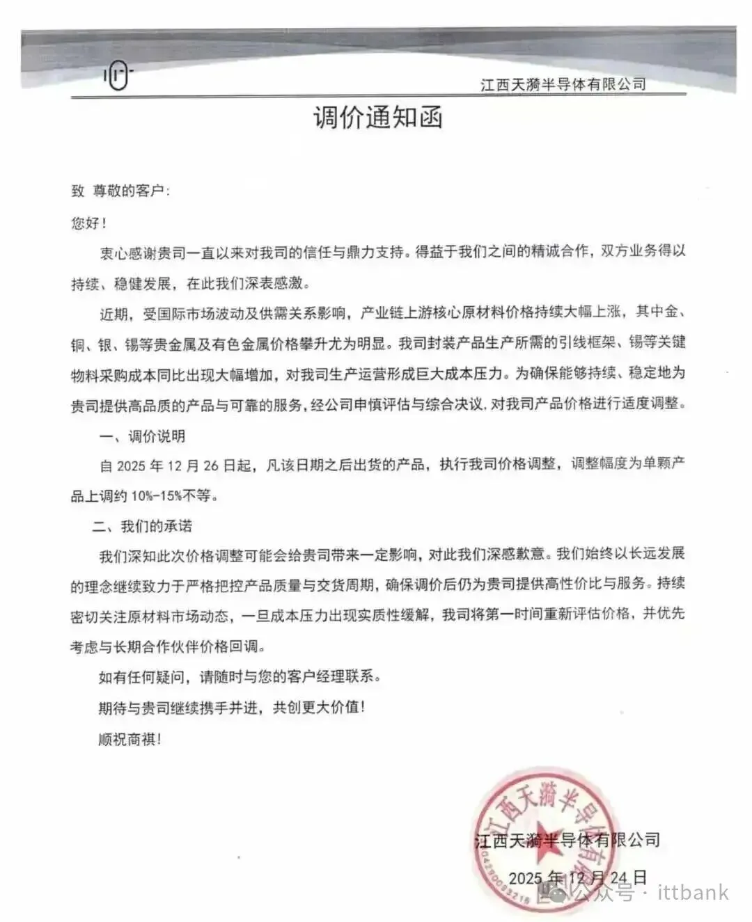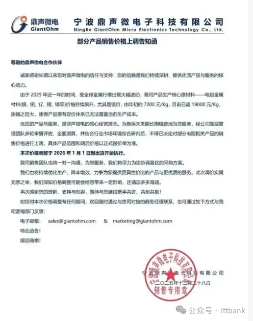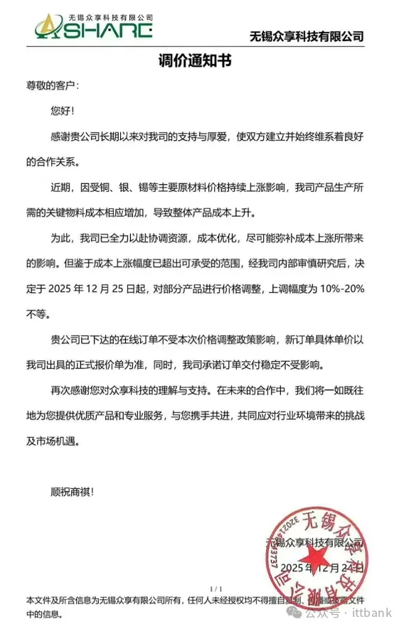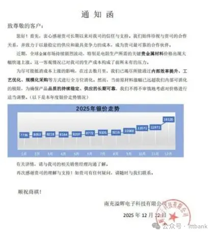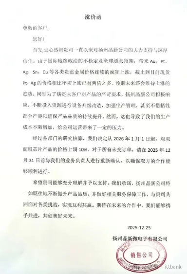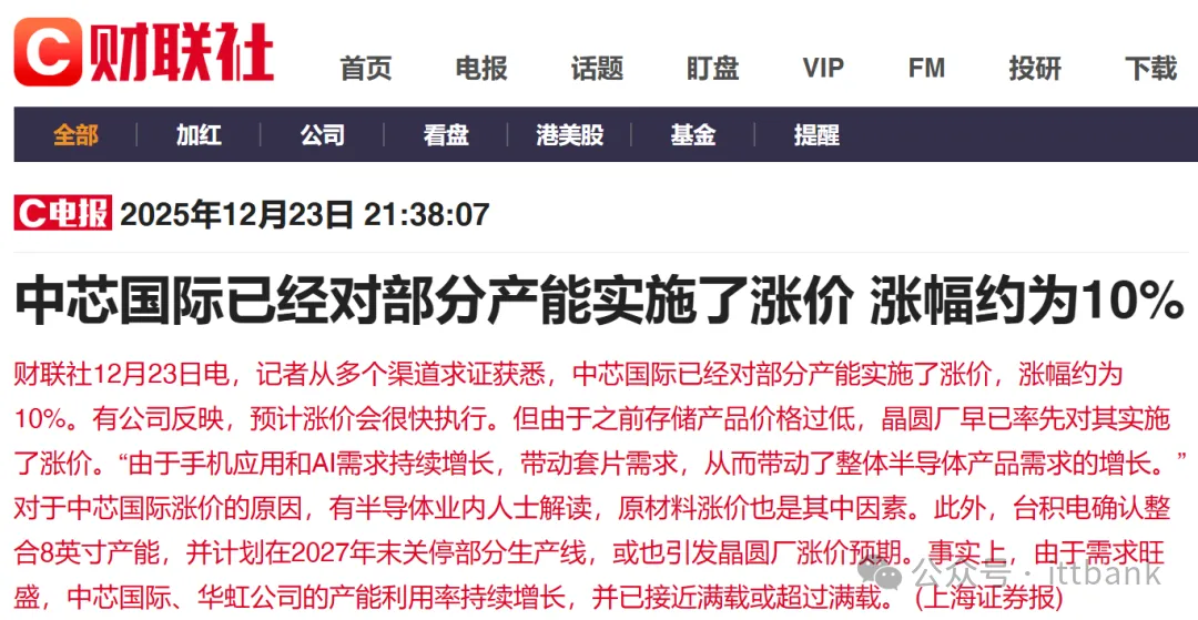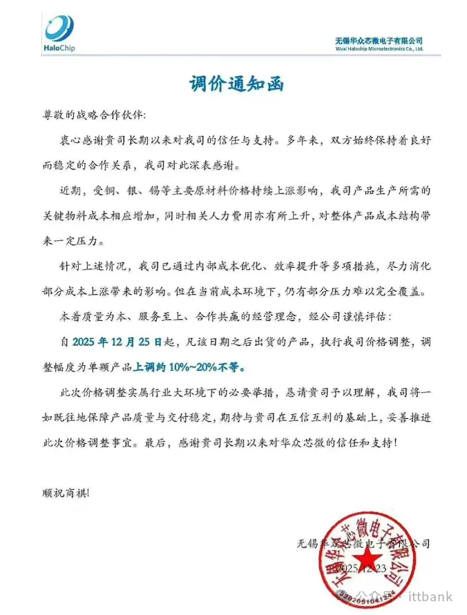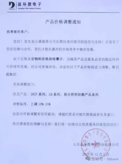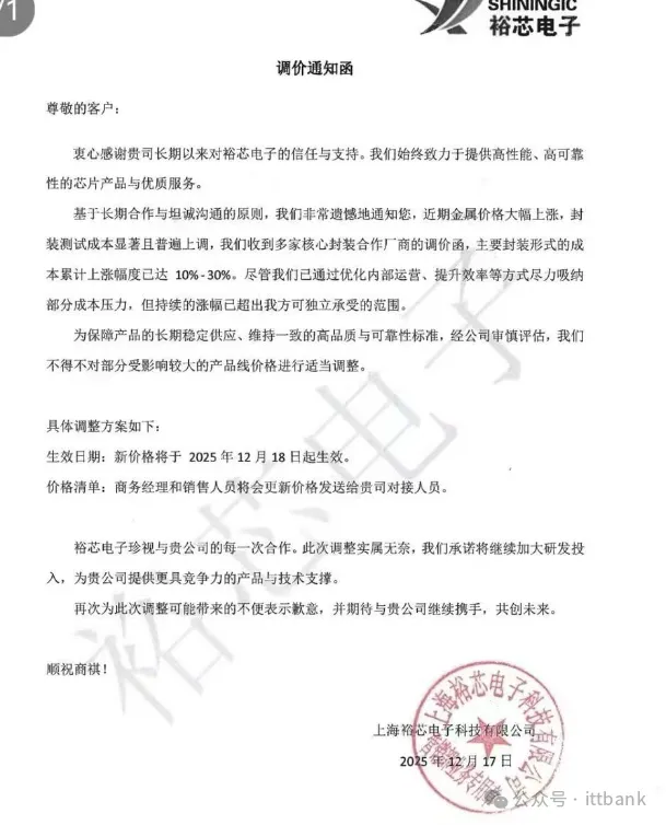上海南麟电子发布涨价函:1月27日,上海南麟电子发布调价通知,受上游晶圆及封装材料价格持续上涨的成本压力影响,公司决定自1月28日起上调部分产品售价,涨幅10%-20%,新订单价格需与该司销售人员沟通确认。