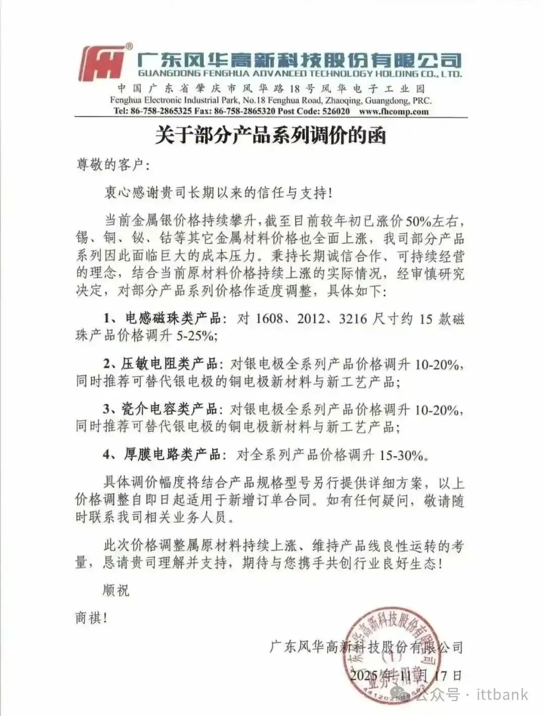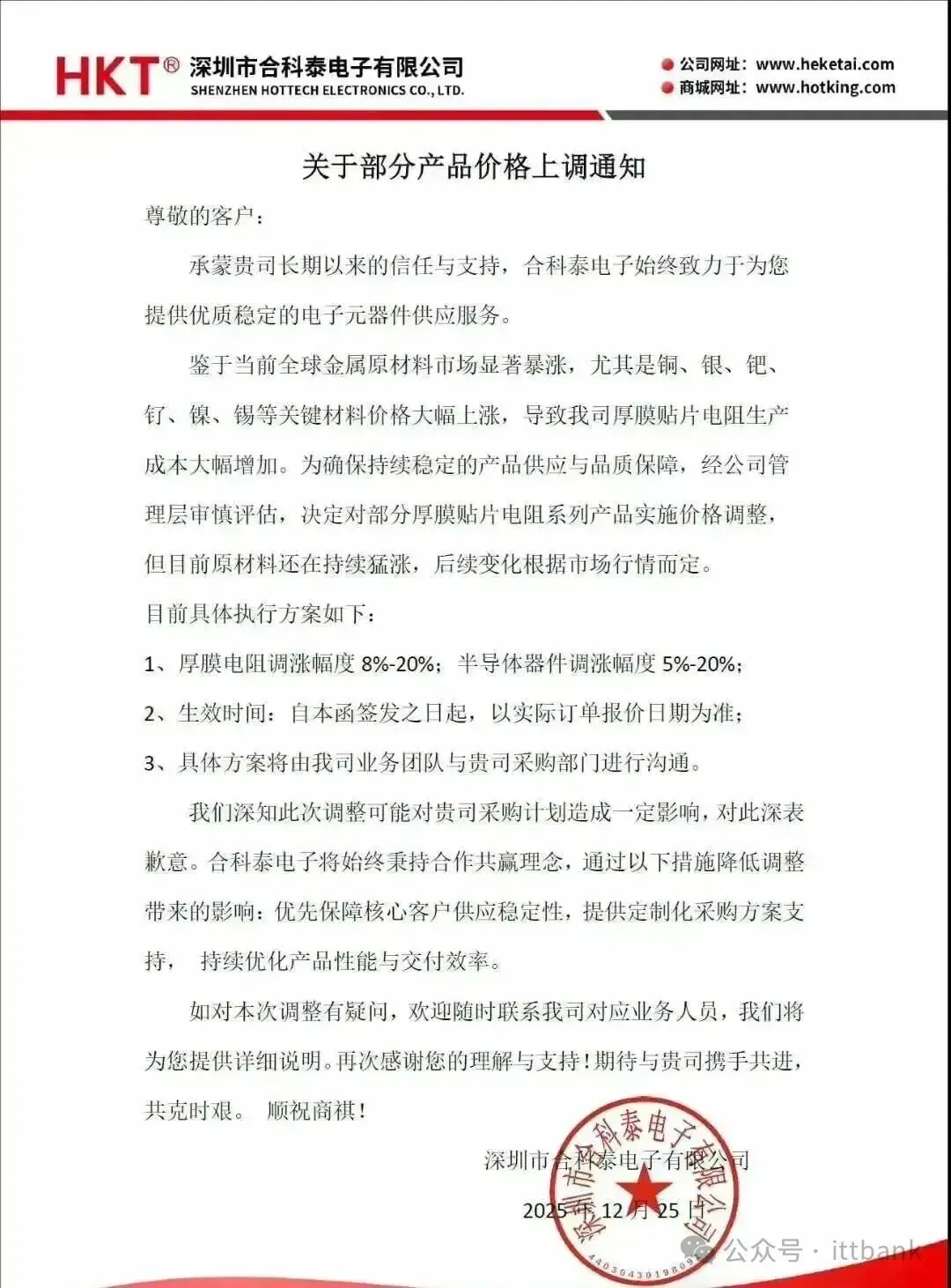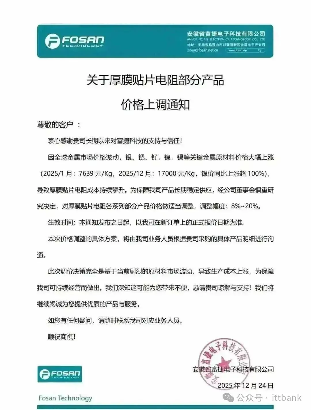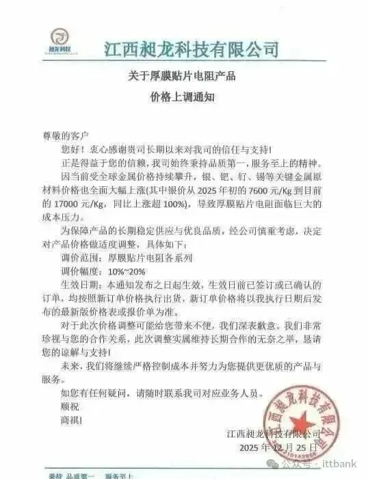 3、浙江玖维电子(特种晶片电阻厂商)科技发布涨价函,由于贵金属材料价格大幅上涨,对产品价格进行上调,新价格以新订单正式报价为准执行。