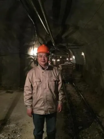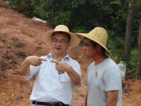 ▲何宏平(左一)在广东梅州平远稀土绿色开采工程现场