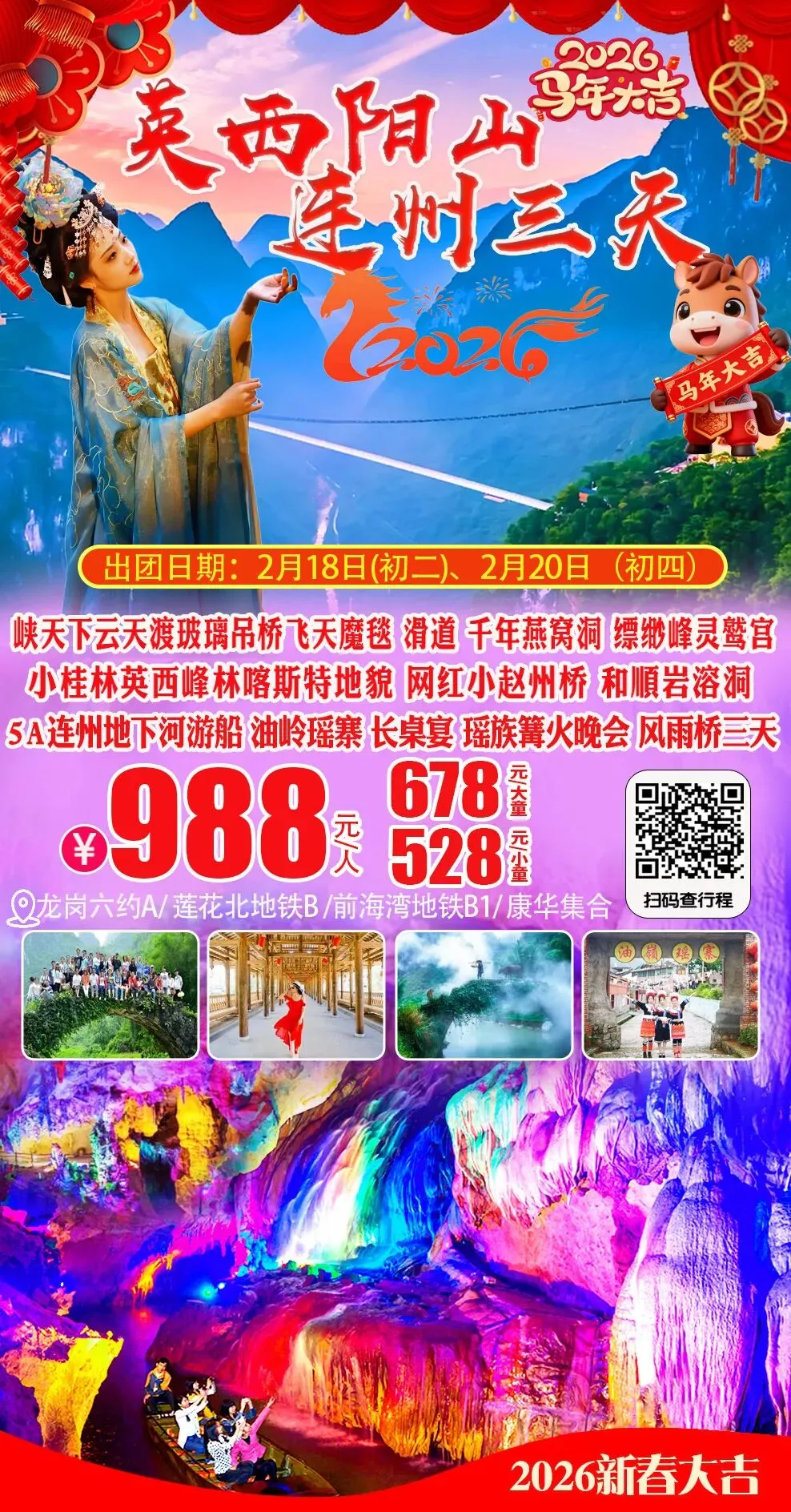 连州地下河+ 峡天下云渡玻璃吊桥+油岭瑶寨+英西峰林+瑶族篝火晚会 988