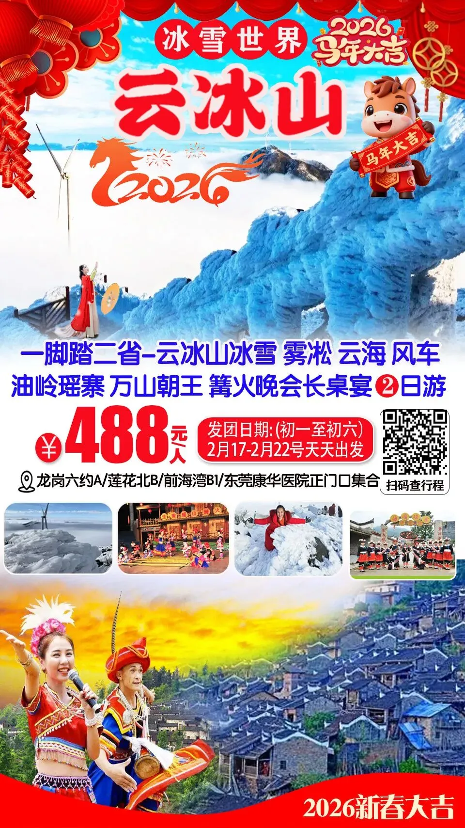 (每周末及假期)一脚跨二省-冰雪世界云冰山冰挂、雾凇、风车、云海、冰雪、油岭瑶寨、万山朝王、瑶族篝火晚会长桌宴二日游 388