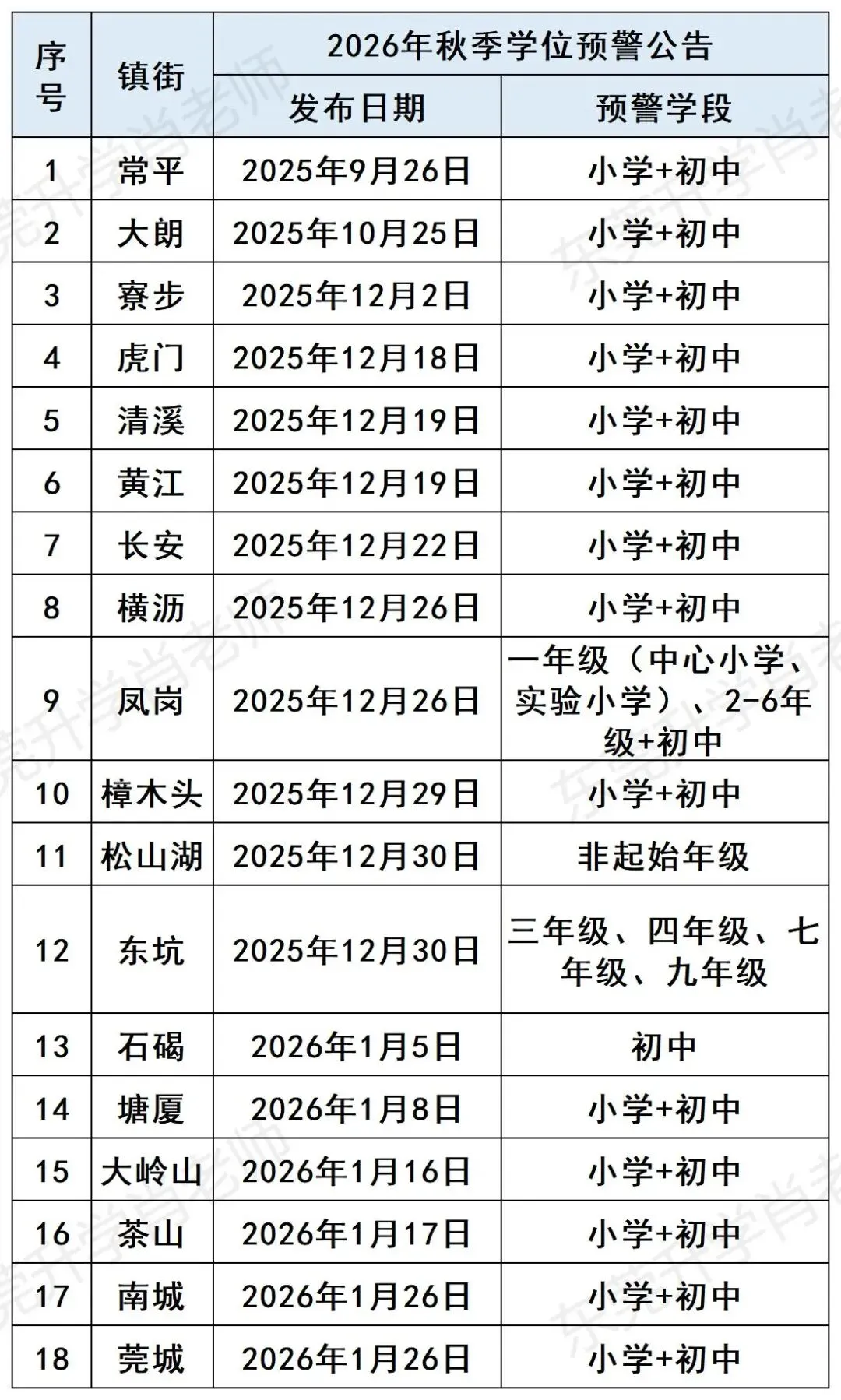截止目前,东莞已有18个镇街发布学位预警,情况如下:1. 如果你家户口在这18个镇街: