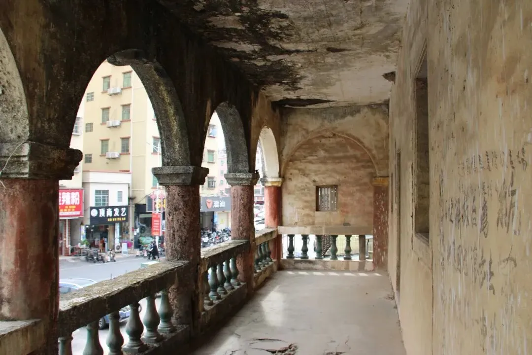 阳台非常宽阔,历经百年风雨,墙面也略显斑驳,但主体结构还算完整。阳台的护栏采用的是琉璃装饰,可以想象,当年刚装修完成的时候是多么金碧辉煌。