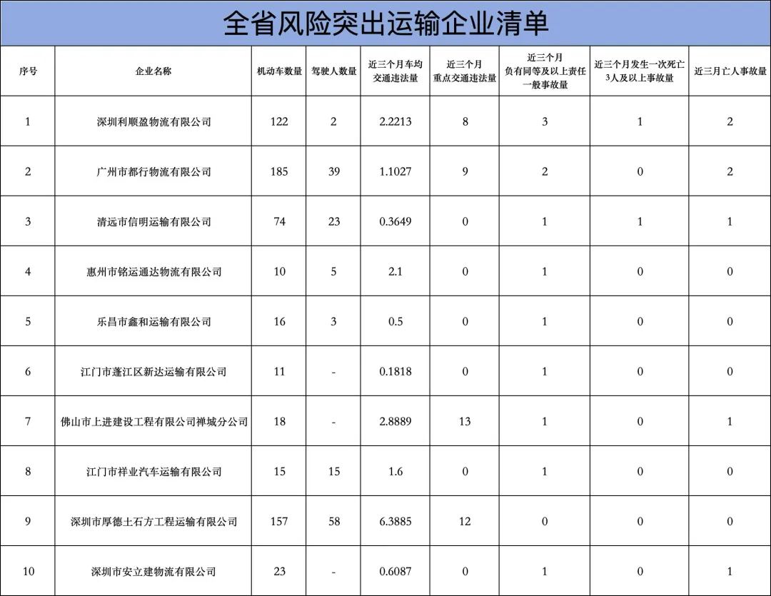 此次曝光的风险突出运输企业共10家,包括深圳利顺盈物流有限公司、广州市都行物流有限公司、清远市信明运输有限公司、惠州市铭运通达物流有限公司、乐昌市鑫和运输有限公司、江门市蓬江区新达运输有限公司、佛山市上进建设工程有限公司禅城分公司、江门市祥业汽车运输有限公司、深圳市厚德土石方工程运输有限公司、深圳市安立建物流有限公司。