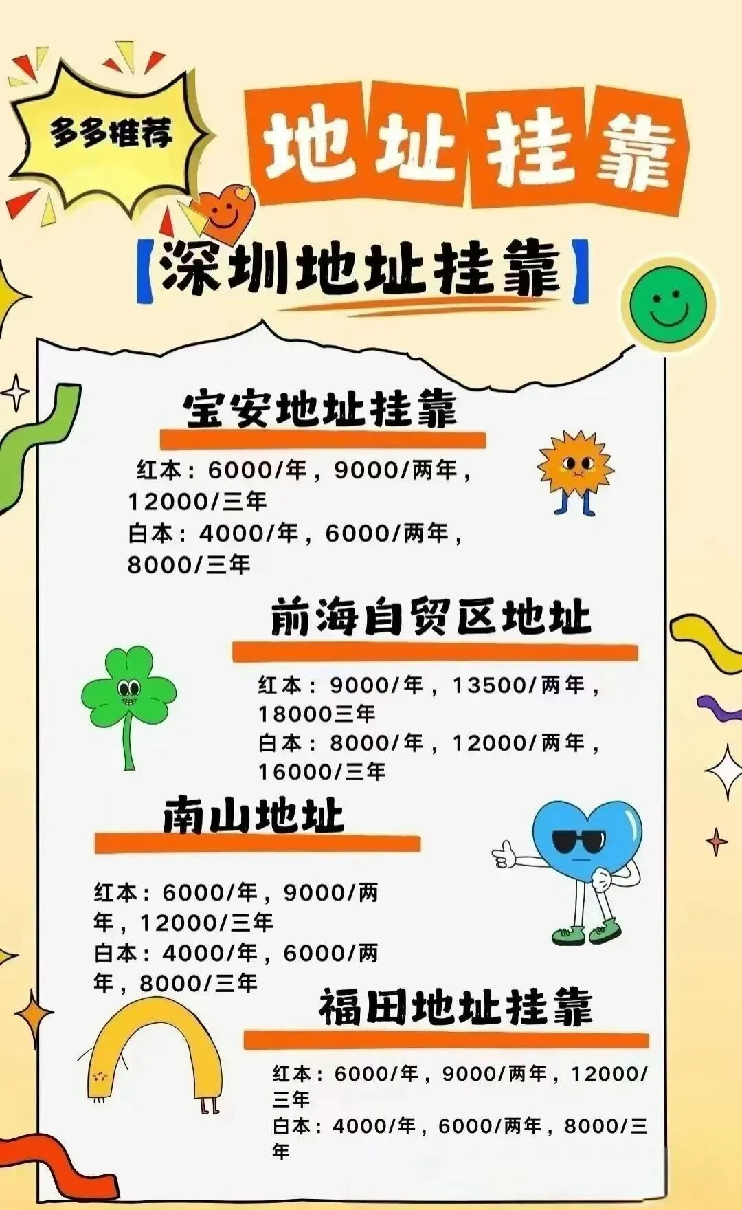地址挂靠不用愁:红本/白本任选,前海/宝安/南山等区域都有合规地址(红本最低6000元/年,前海红本9000元/年,两年更划算!),工商注册/银行开户直接对接