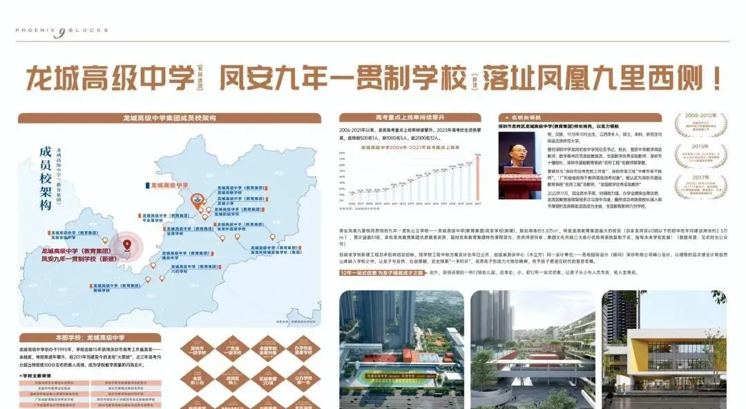 创立于1995年的龙城高级中学,在29年的成长历程中逐步从广东省国家级示范高中发展出小学、初中、高中全学段覆盖12年一贯制“一条龙”教育体系。截至2023年高中本部拥有国家级省级名师26人,市区级名师超过100人,正高级教师6人,高级教师136人。(数据来源:见圳时光官方公众号)