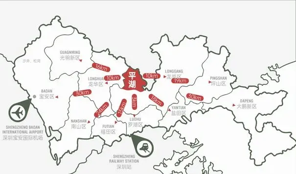 在地图上可以清楚地看到,平湖出发去往罗湖、福田距离仅约10-14km左右(百度地图测距)开车大约半小时车程,比龙岗很多地方(如龙岗中心城等)更近市中心。
