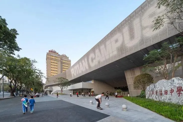 北京reMIX临界事务所设计的福田中学被誉为“高密度之王”,通过校门后移等零退线策略,向外围城市释放近千平米入口广场,贡献了开放共享的优质城市界面。
