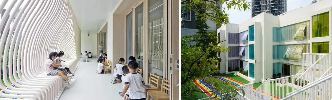 一系列实践让老旧校园重焕生机:顾田(顾田建筑主持建筑师、香港中文大学兼职讲师)与沈梦岑(沉默建筑工作室主持建筑师)合作设计的海月华庭花园幼儿园,以彩色波浪状钢管格栅为点睛之笔——既是崭新外立面,也是走廊里孩子们可攀爬、落座的游戏空间,将安全限制转化为孩子们日常生活想象力的激发载体,看似冰冷的材料空间结构,实际上却参与塑造了一代新人;可完全打开的推拉门扇实现教室与走廊无界融合,拓展了儿童教学与活动的场地;立体游乐平台整合多种功能,既形成新城市界面,又激活街道氛围。