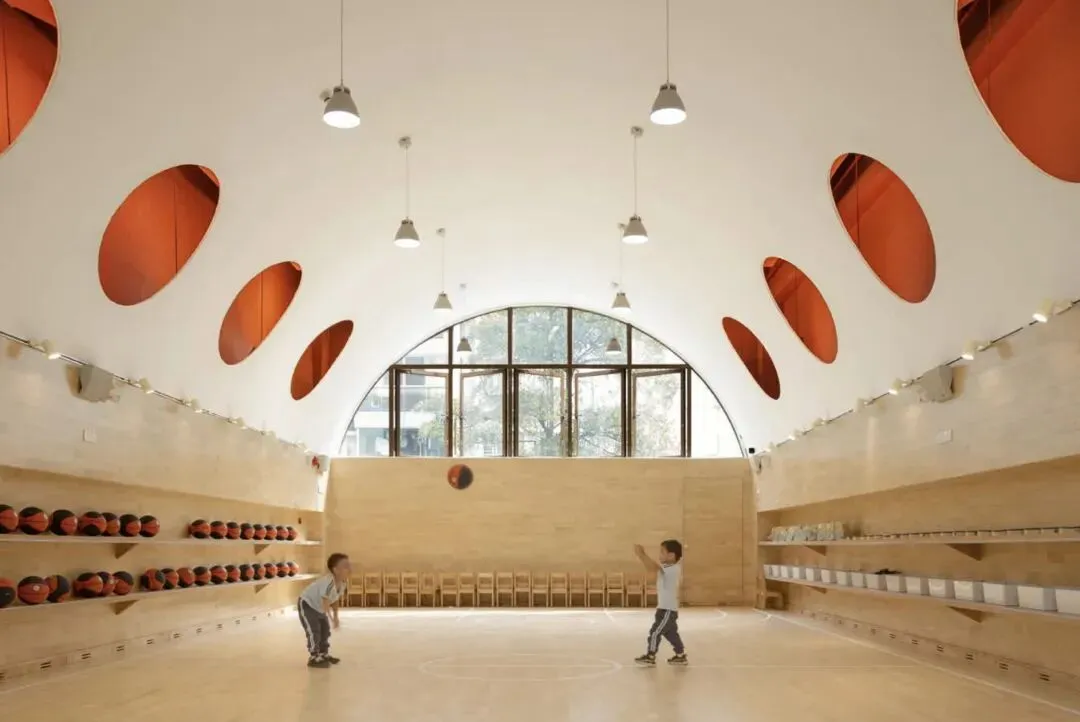 姜伯源设计的碧榕湾幼儿园,不仅更新了多功能外立面,音体室设计更显巧思——原本有安全隐患的空间,改造为半圆拱顶结构,收纳诸多设备与功能,空间高度过渡贴合儿童的空间感知,让孩子们在其中运动更舒适自然。
