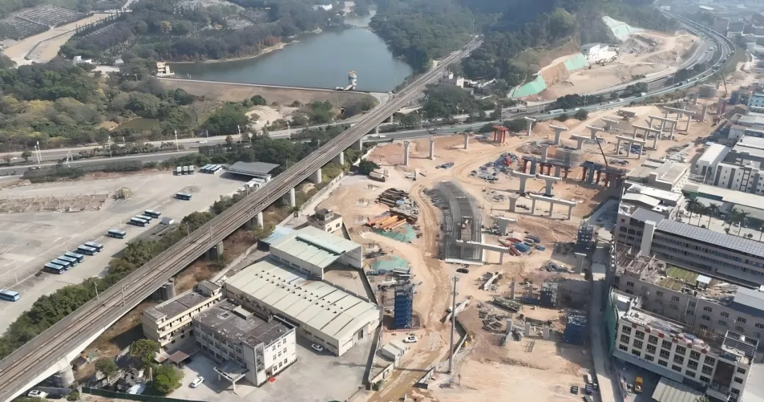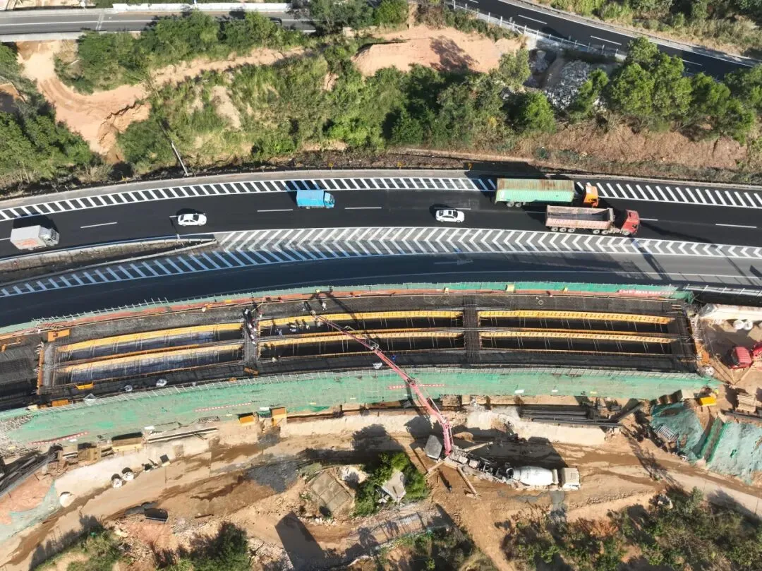 作为省市重点攻坚项目,随着莞深高速管理中心互通两座上跨高速主线的匝道桥梁顺利拆除,莞深高速改扩建工程已稳步迈入交通转换阶段施工。目前,莞深高速及龙林支线全线桥梁结构物、路基、边坡已初具规模,开展路基填筑、边坡防护、桥梁立柱及盖梁、沥青路面基层等工程施工,项目整体完工进度达40%,预计2026年将全面启动沥青路面铺设及桥梁梁板架设作业。
