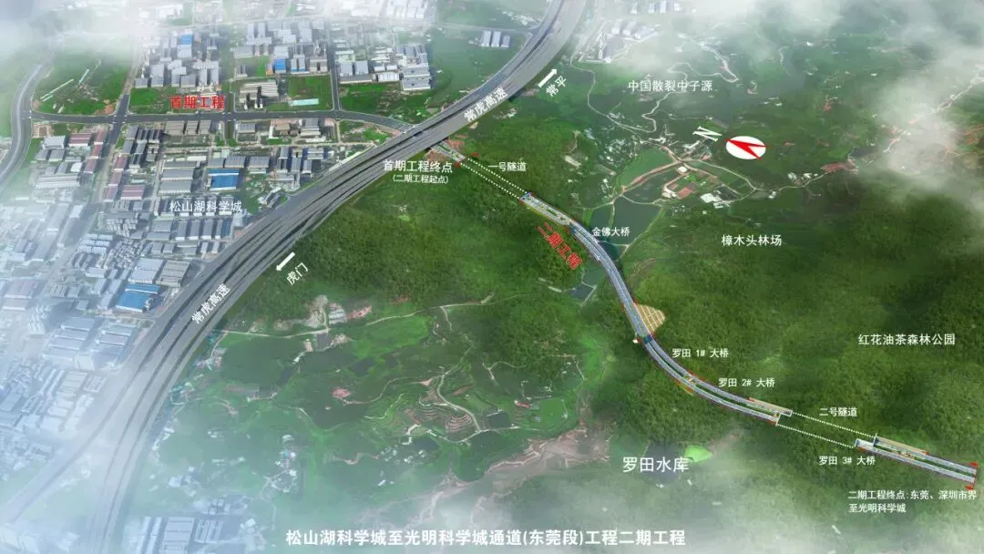 该项目起点顺接科学城通道首期工程,往西南以S形曲线穿越罗田水库现状物理隔离区、二级水源保护区及樟木头林场,终点至莞深交界处顺接深圳段南光快速北延,全线长约2.4km,力争2028年6月实现全面贯通,为深莞两地科学城协同发展搭建便捷交通桥梁。