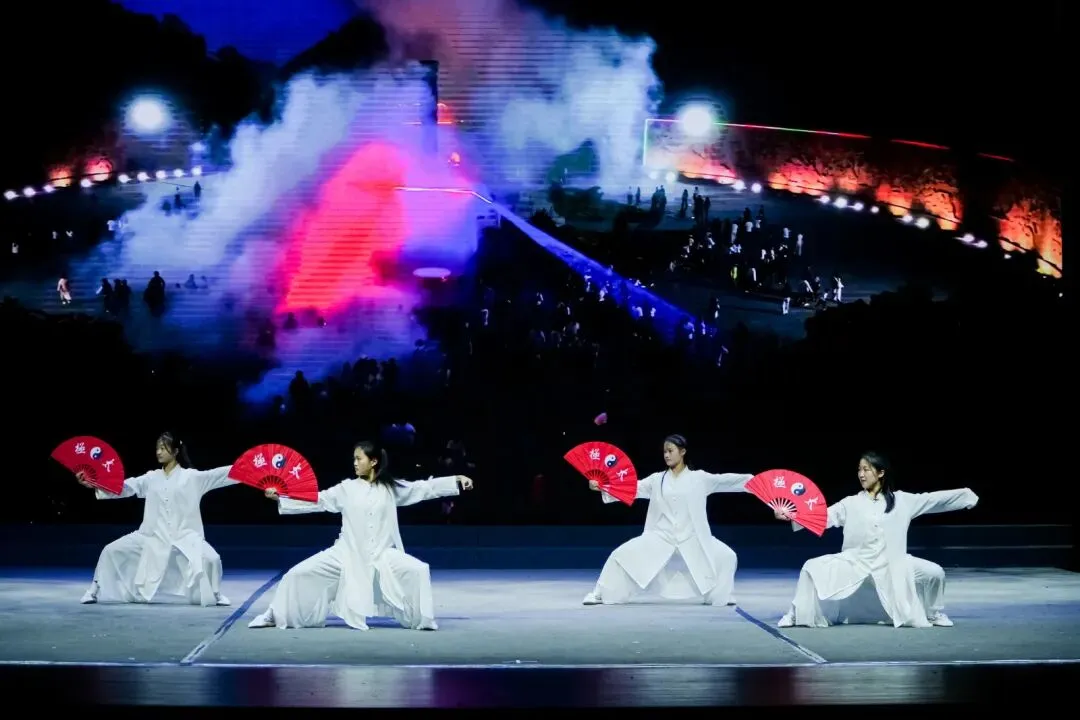夜幕降临,大幕轻启。舞台上,巍峨的嵩山剪影在灯光下显现,朱红的少林院墙层层叠叠、古朴庄严。忽然,漫天“鹅毛大雪”从天而降,映衬着斑驳红墙,瞬间将全场观众带入了一个如诗如画、苍茫辽远的功夫世界。