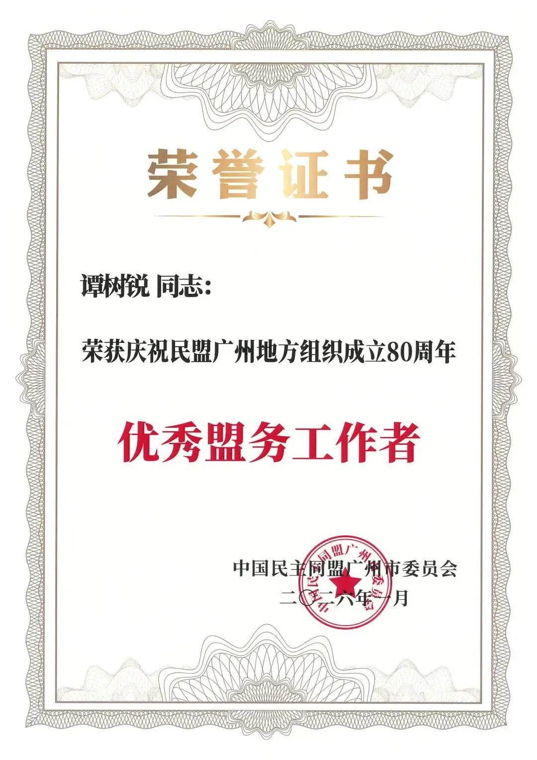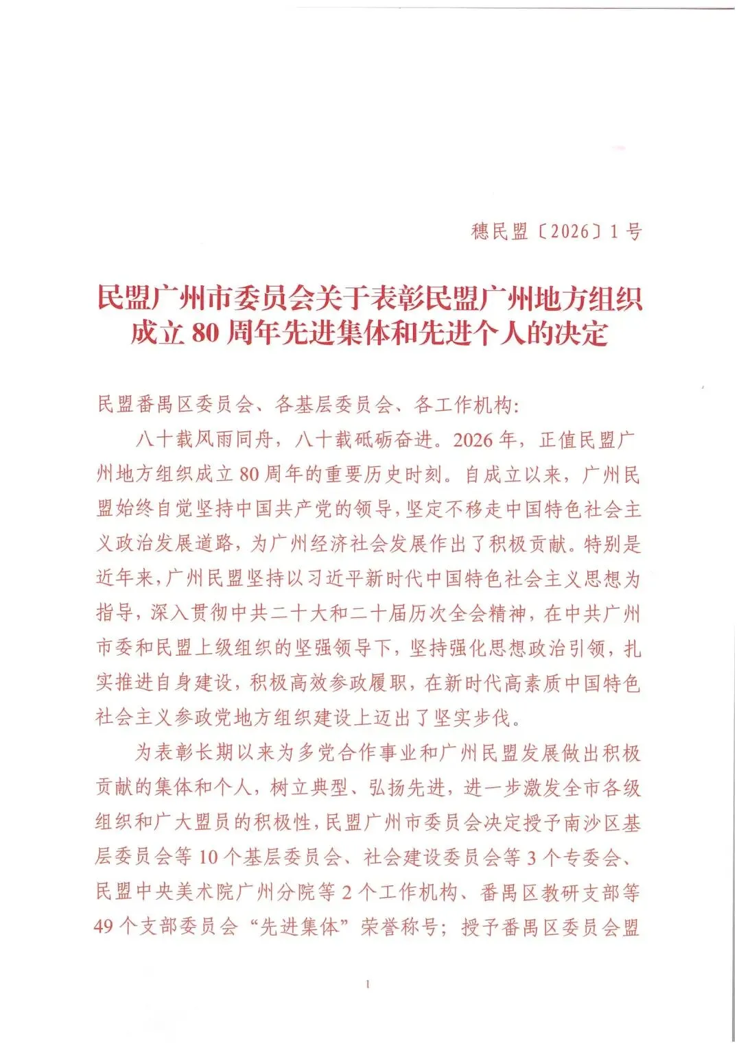 2026年1月,广州民盟启动成立八十周年系列庆祝活动。1月24日,庆祝民盟广州地方组织成立80周年暨“学规定、强作风、树形象”主题教育成果展演成功举行,大会回望广州民盟光辉历程、致敬奉献盟员、凝聚奋进力量,续写同心筑梦的崭新篇章。