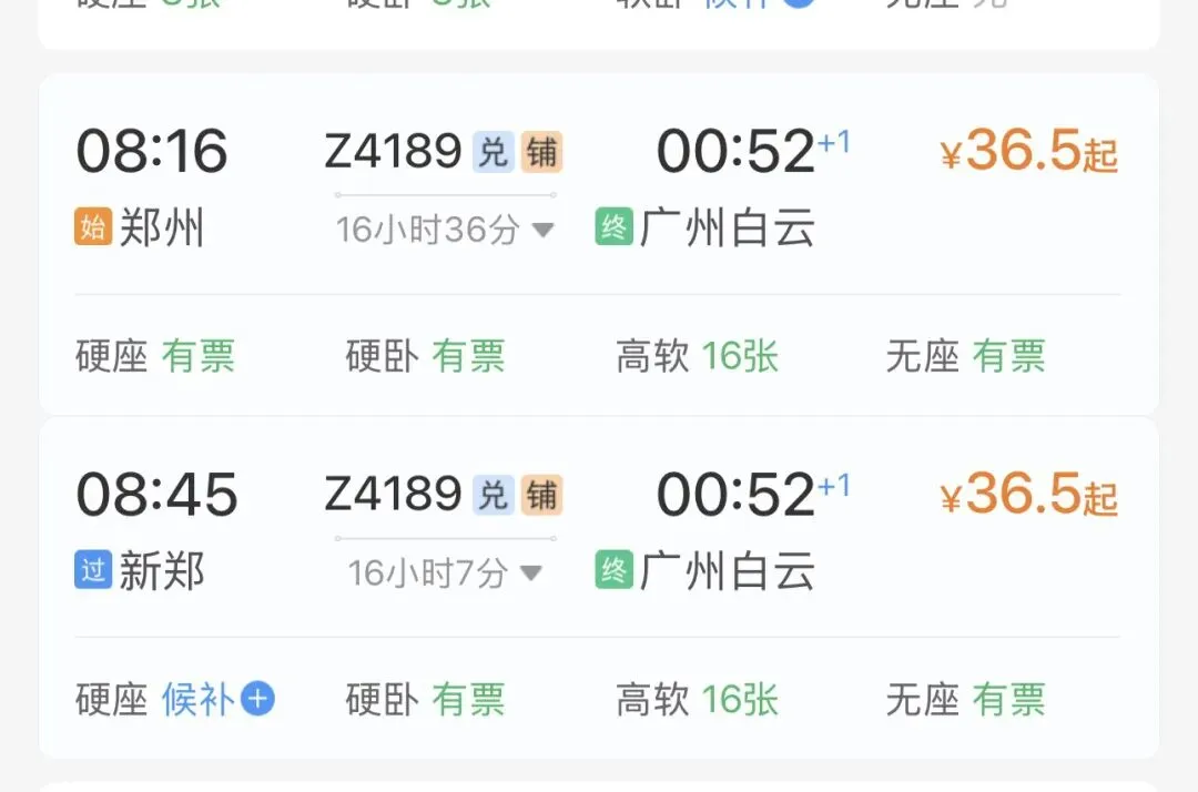 据铁路12306消息称,2026年2月7号起,对Z4189次郑州至广州白云站的列车实行优惠购票政策,原价全程硬座189.5元届时只要36.5元,