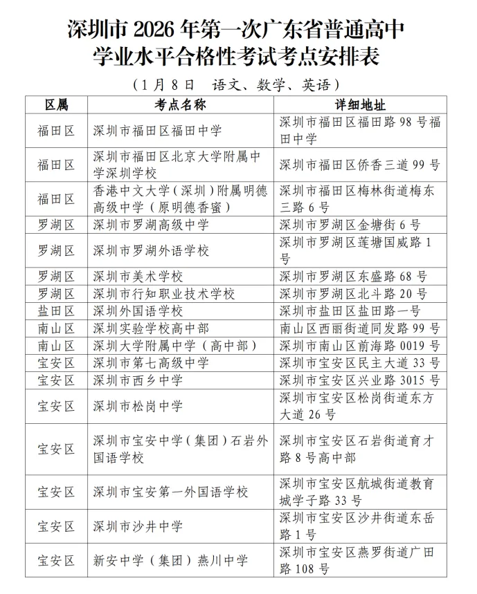根据广东省教育考试院部署,2026年第一次合格性考试将于1月8日至10日举行,考试科目为语文、数学、英语、思想政治、物理、历史、地理、化学和生物学共9门,其中,语文、数学、英语3门科目是高职院校依据普通高中学业水平考试成绩招生录取的主要依据;普通高等学校招收中等职业学校毕业生考试(以下简称“3+证书”考试)将于1月10日至11日举行。为确保考试平安顺利进行,根据省教育考试院及我市工作要求,市招考办提醒各位考生注意以下事项:
