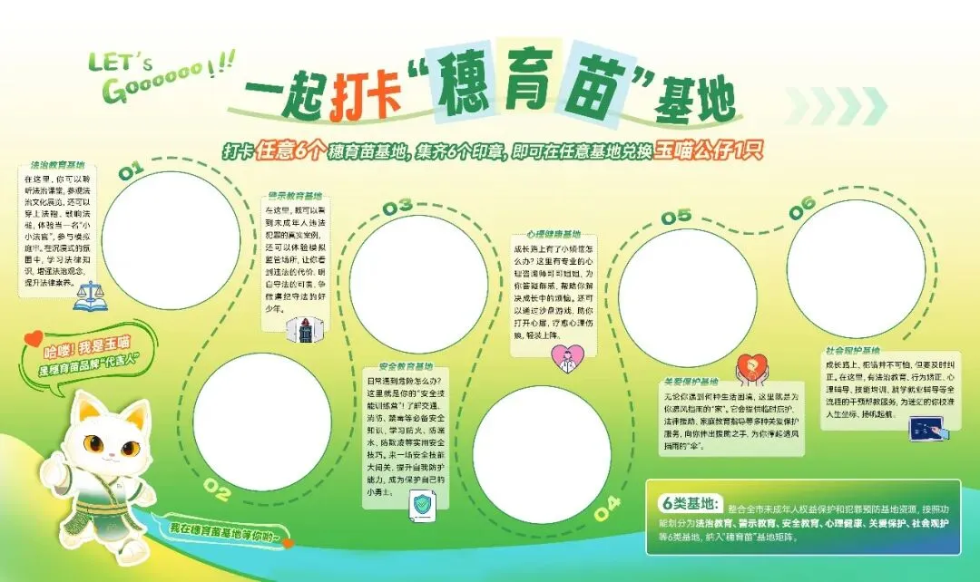 同步开展“穗育苗”品牌体系建设,精心设计品牌标识、打造“玉喵”卡通IP形象、推出“守护少年的你”宣传口号,开发手办、集章卡、打卡章、表情包等“玉喵”系列文创产品。设置打卡激励任务,小朋友集满6个印章即可兑换“玉喵”手办,进一步提升未成年人的参与积极性。