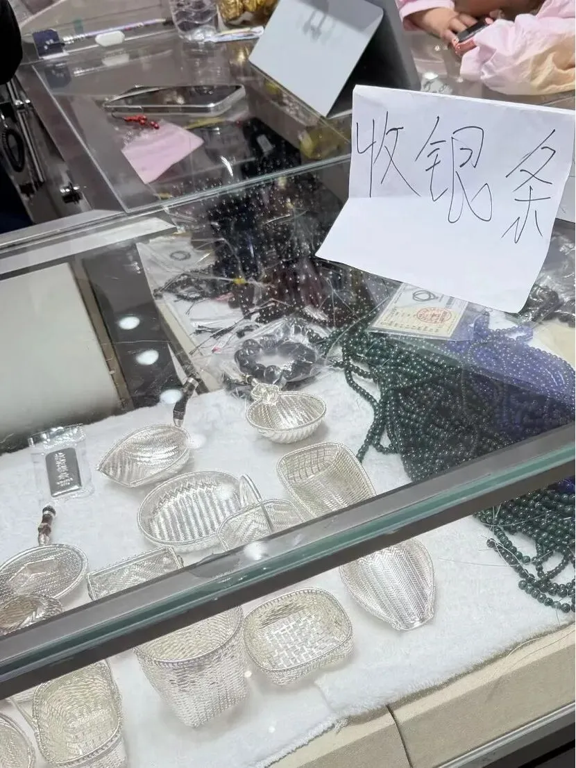 “一共十几克就算了,加起来才两三百元。”一位柜台打着“收银条”标志的商家告诉财联社记者,记者手上的银项链克重较低,并不在其回收范围内,他的回收生意以克重较高的银条等产品为主。