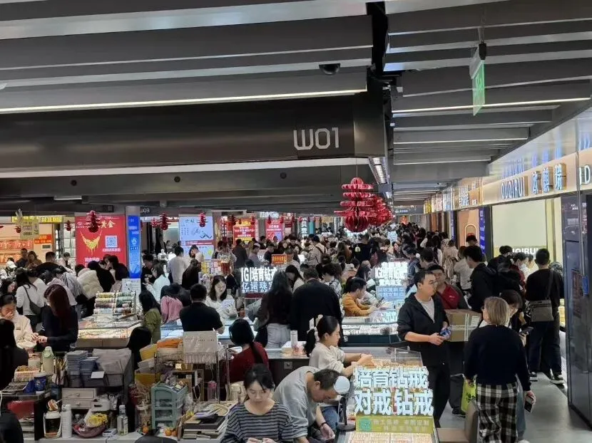 财联社记者在水贝市场发现,虽然目前水贝市场人气仍高,但与往年旺季“人挤人”的情况相比还是有不小差距。
