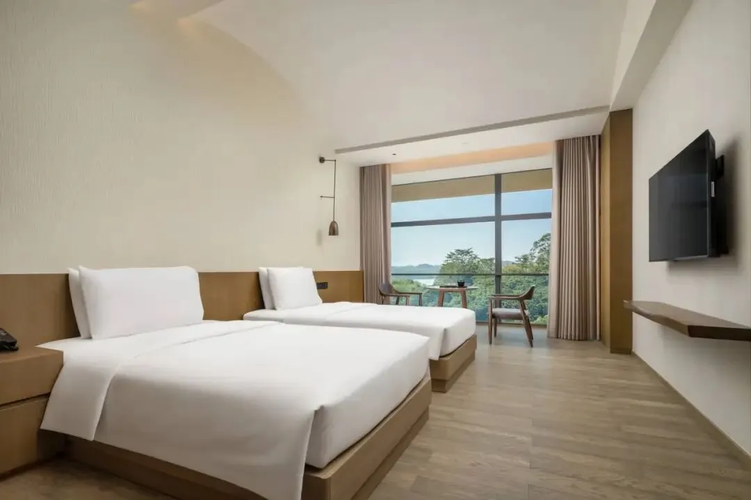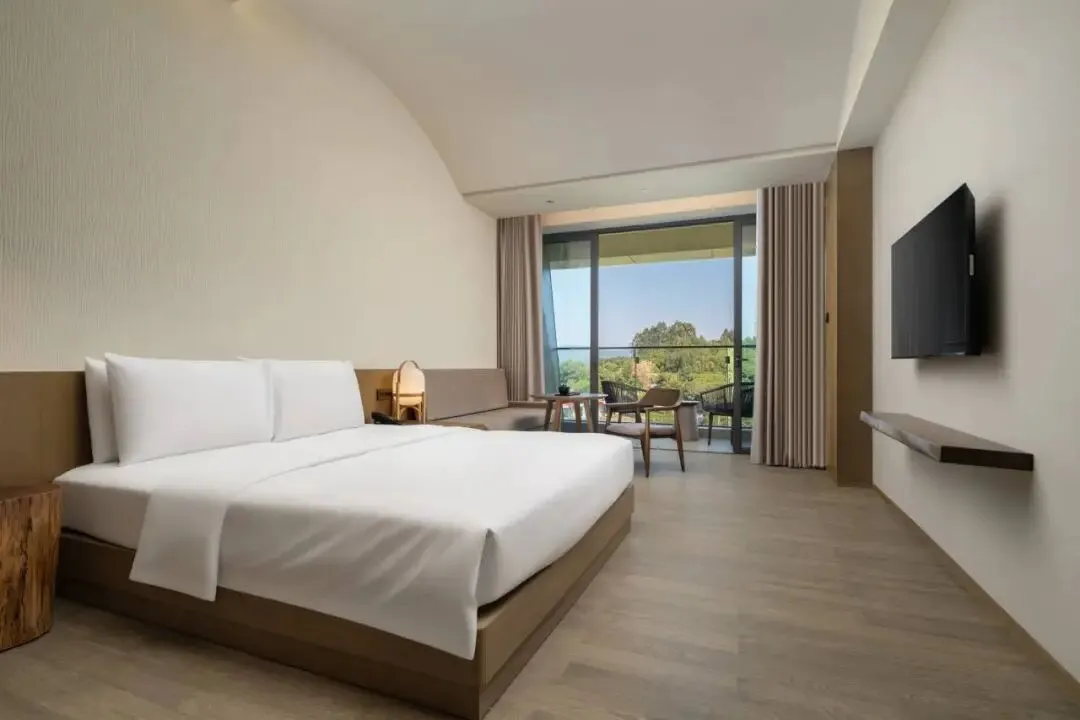 酒店坐拥7000亩增城荔湖浩渺波光,将湖色天光收纳为窗景,成就都市近郊的湖居秘境。