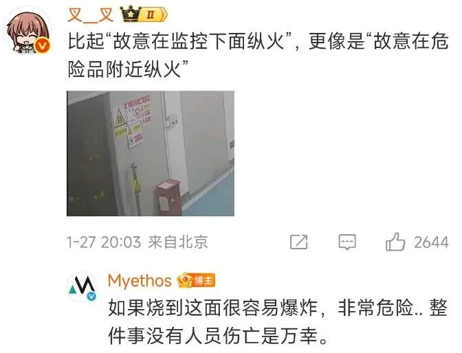 以下是事故现场监控视频,该纵火人员为合作劳务公司派遣的搬运临时工,万幸目前该事件未造成人员伤亡。目前该案件已提交至相关多个部门调查处理。