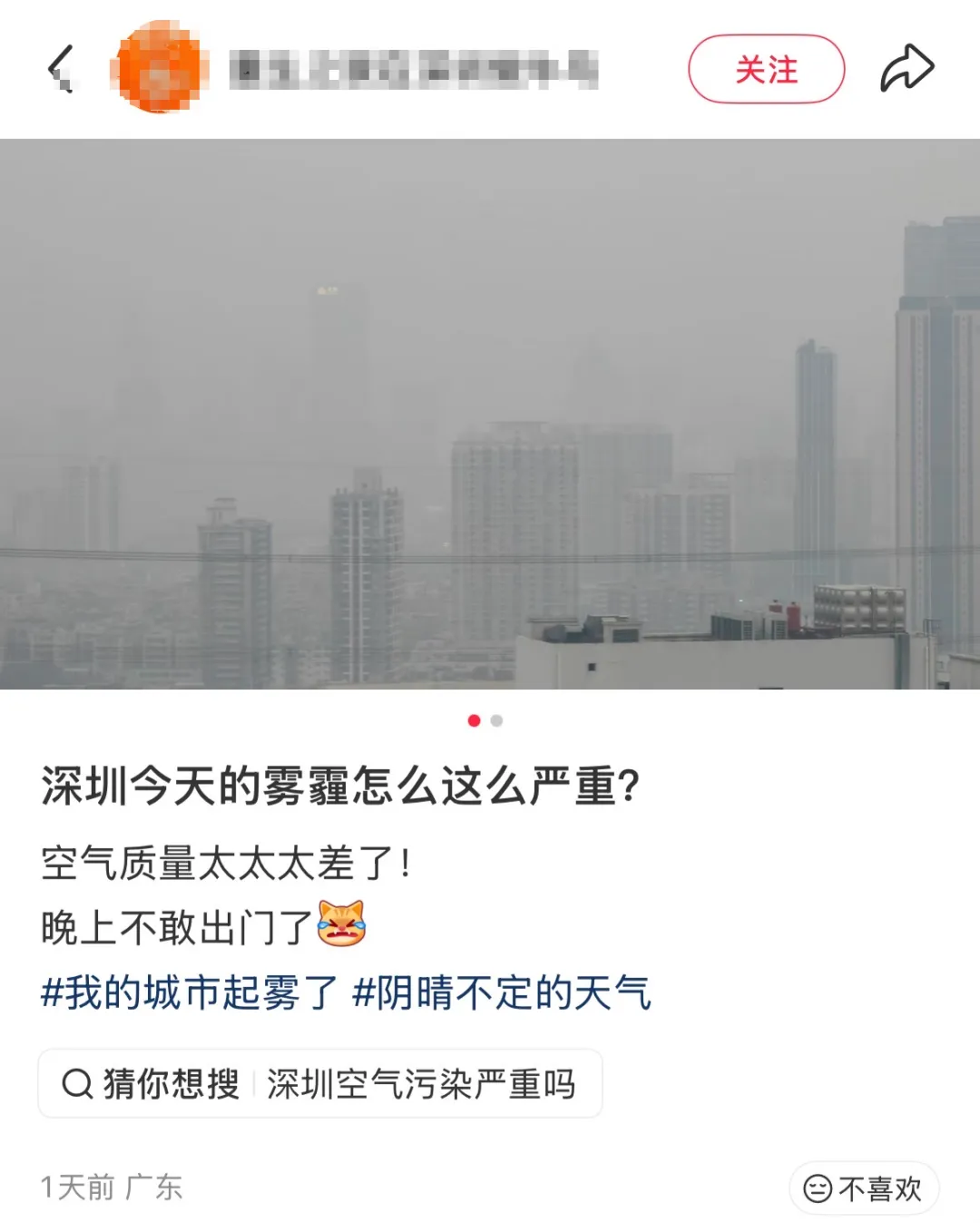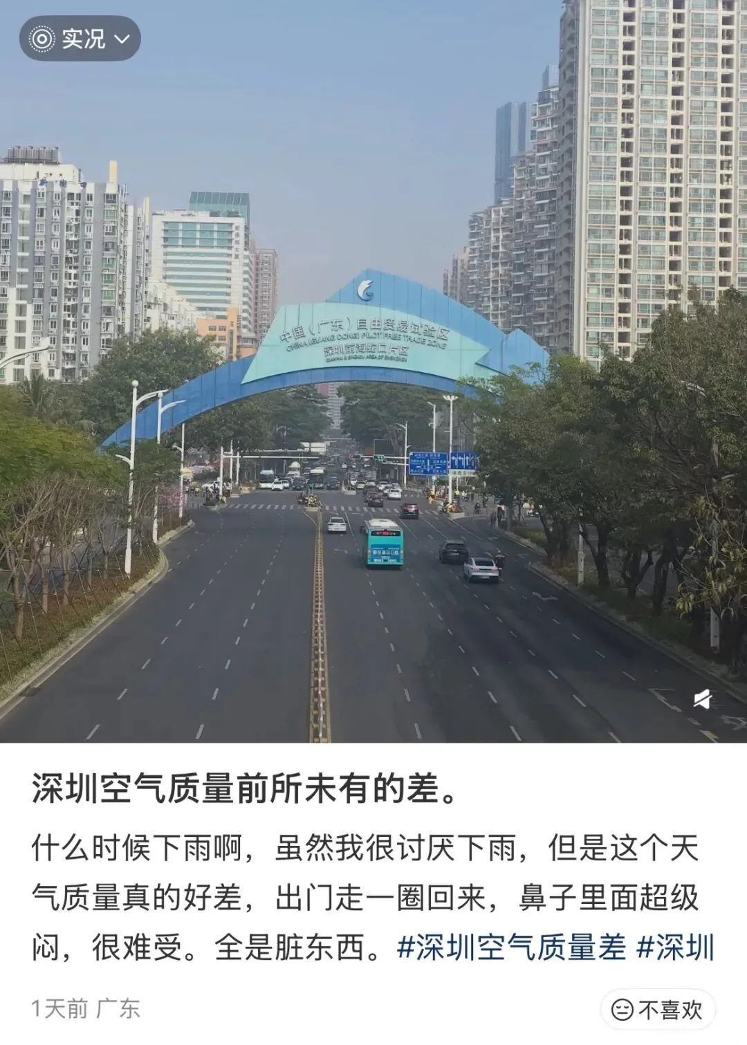 根据气象监测,深圳近期天气持续回暖,风力较弱。相关专家解释,冬季天气回暖时,常伴随风速下降和大气边界层降低,导致大气的水平及垂直扩散能力双双减弱。这种气象条件会使环境容量“缩小”,本地及周边的污染物更容易在近地面堆积,从而形成能见度下降的短期现象,在气象学上属于季节性的常见情况。深圳市气象局此前也曾指出,冬季、春季是深圳全年雾的多发期,此类天气过程具有阶段性特征。