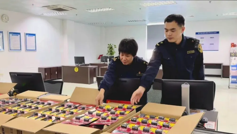 东莞海关关员在跨境电商渠道查获侵权剃须刀86400把。林惠纯/摄