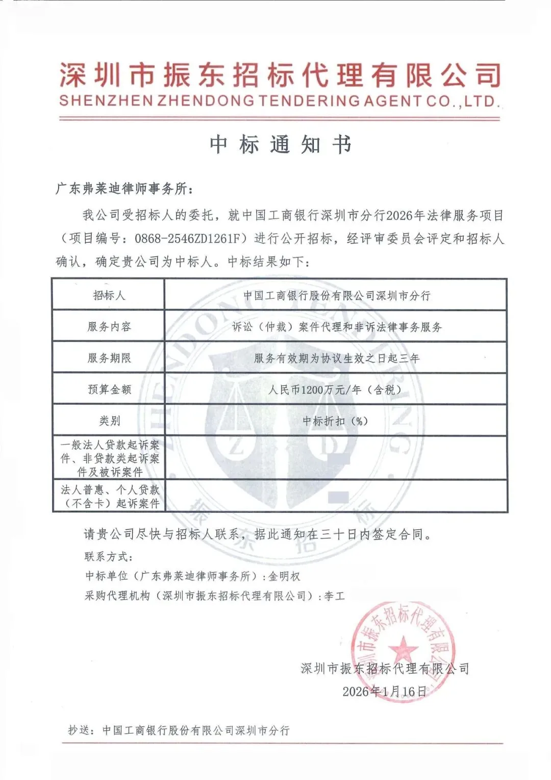 弗莱迪业绩丨弗莱迪律所中标中国工商银行深圳市分行2026年法律服务项目