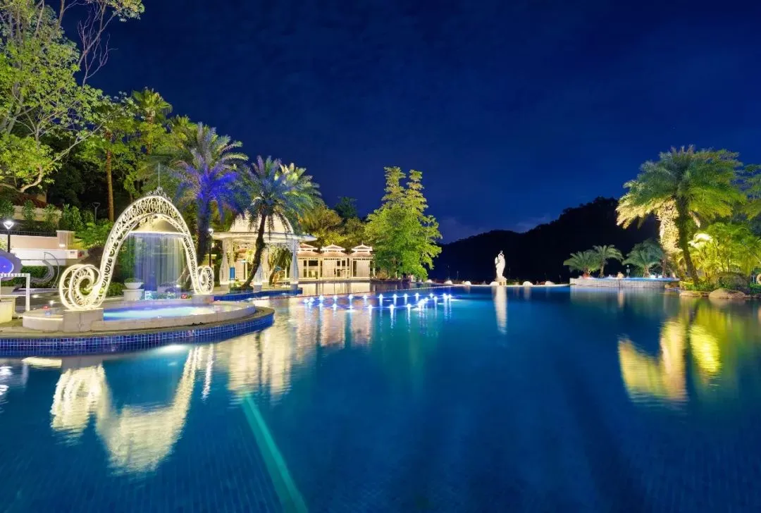 夜幕来临,绮丽灯光照耀温泉池