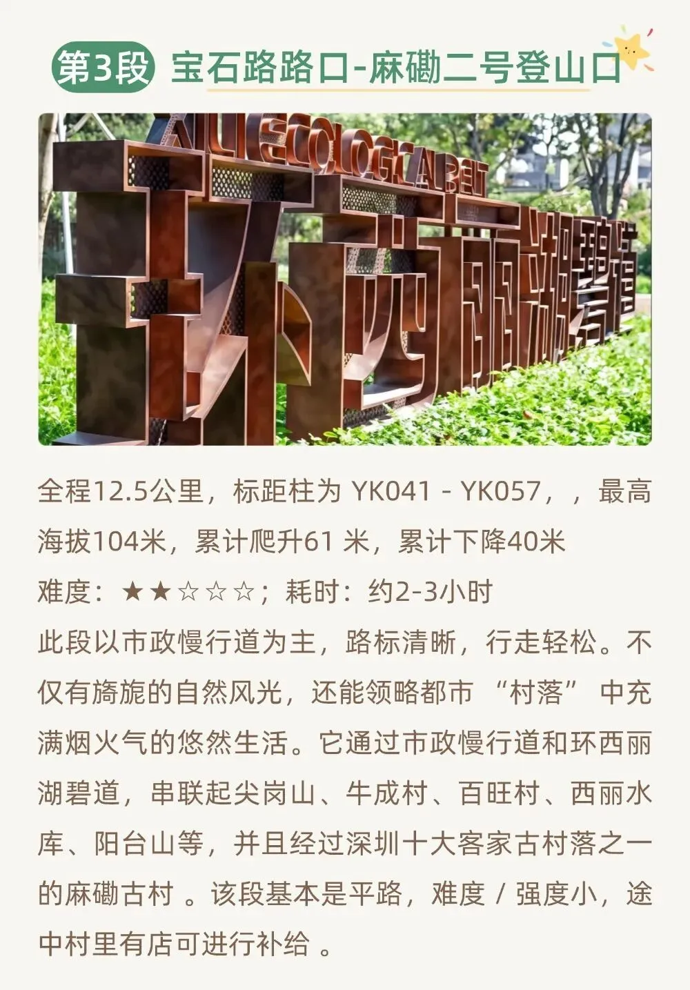 鲲鹏径第三、四段,起点宝石路路口,途经牛成村、百旺村、西丽湖环湖绿道,大阳台山、终点王京坑工业区(YK041-YK073 标注距),全程约18公里,其中大阳台山海拔 587 米,累计爬升约 584 米,全程有土路、台阶、绿道,土路有泥沙很滑,一定要穿户外防滑鞋。预计6-7小时完赛,越野跑者根据实力不同时间约 2-4小时。