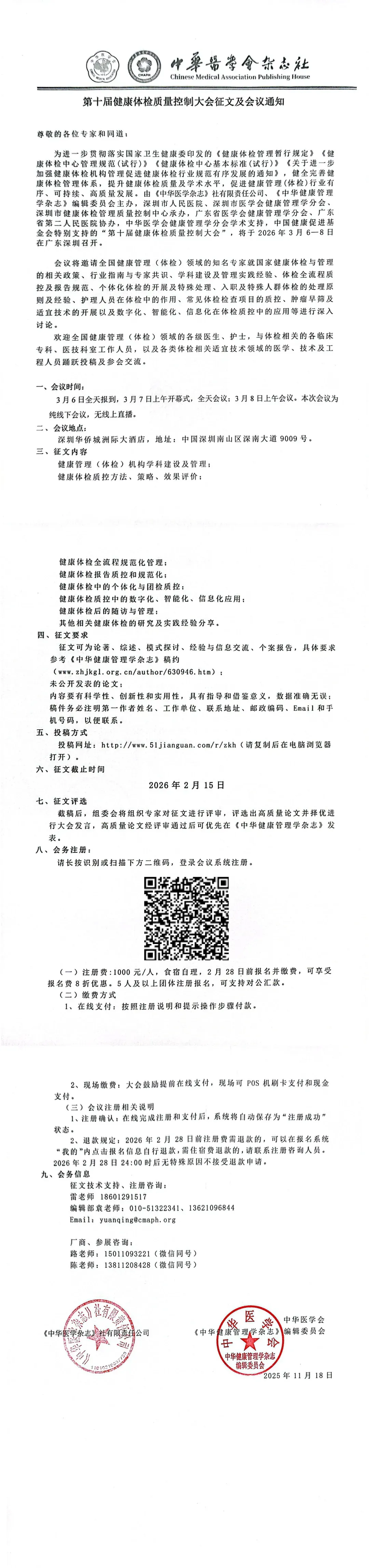 为进一步贯彻落实国家卫生健康委印发的《健康体检管理暂行规定》《健康体检中心管理规范(试行)》《健康体检中心基本标准(试行)》《关于进一步加强健康体检机构管理促进健康体检行业规范有序发展的通知》,健全完善健康体检管理体系,提升健康体检质量及学术水平,促进健康管理(体检)行业有序、可持续、高质量发展。由中华医学会杂志社、中华医学会《中华健康管理学杂志》编辑委员会主办,深圳市人民医院、深圳市医学会健康管理学分会、深圳市健康体检管理质量控制中心承办,广东省医学会健康管理学分会、广东省第二人民医院协办,中华医学会健康管理学分会学术支持,中国健康促进基金会特别支持的“第十届健康体检质量控制大会”,将于2026年3月6—8日在广东深圳召开。