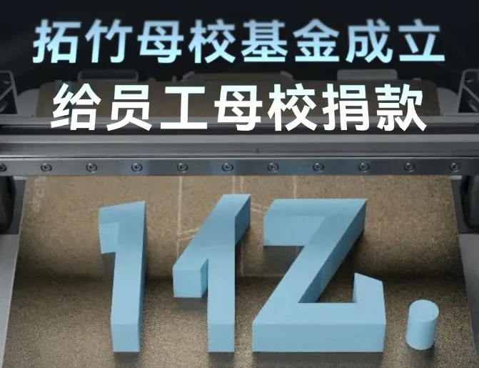 1月27日,拓竹科技微信公众号发文称,成立“拓竹母校基金”并向员工母校捐赠1亿元。文章称,每个员工的专业都不一样,有的来自文理工科,也有艺术、设计出身,或以职业技术见长。综合不同领域的人才来源,拓竹科技选出了对公司人才贡献密度排名前十的高校,包括电子科技大学、哈尔滨工业大学、华南理工大学、华中科技大学、上海交通大学、深圳职业技术大学、西安交通大学、香港科技大学、中国科学技术大学和中国美术学院。