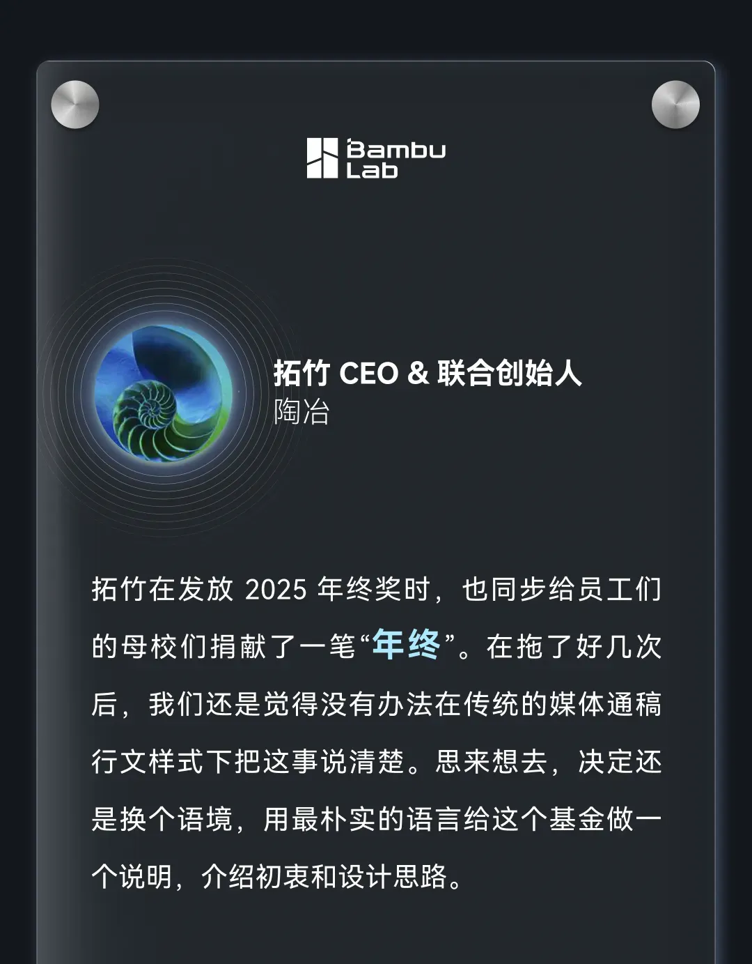 陶冶表示,给母校捐一笔钱大概是2025年中时定下的,当时拓竹年营收破百亿的预期已经比较明朗了,创始人团队觉得公司到了有能力回馈母校的阶段了。“公司过去五年的发展,几乎可以百分百归功于广大员工。拓竹的业务决定了我们无法依靠少数几个‘英雄人物’去搞定特定技术点、投资人、关键大客户等等。”