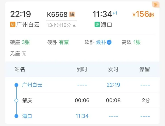 始发广州白云站的加开列车于晚上出发,次日中午抵达海口,全程用时约13小时15分。车票种类包括坐票和卧票,价格156元起。
