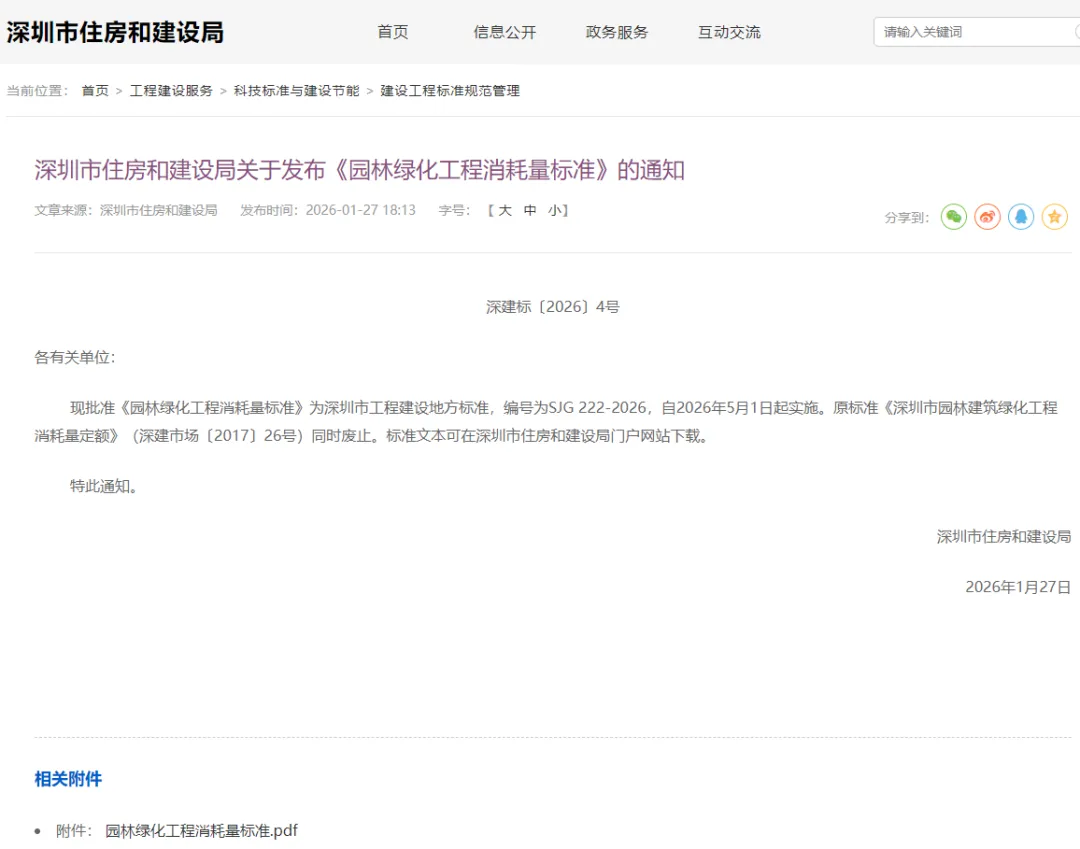 现批准《园林绿化工程消耗量标准》为深圳市工程建设地方标准,编号为SJG 222-2026,自2026年5月1日起实施。原标准《深圳市园林建筑绿化工程消耗量定额》(深建市场〔2017〕26号)同时废止。标准文本可在深圳市住房和建设局门户网站下载。